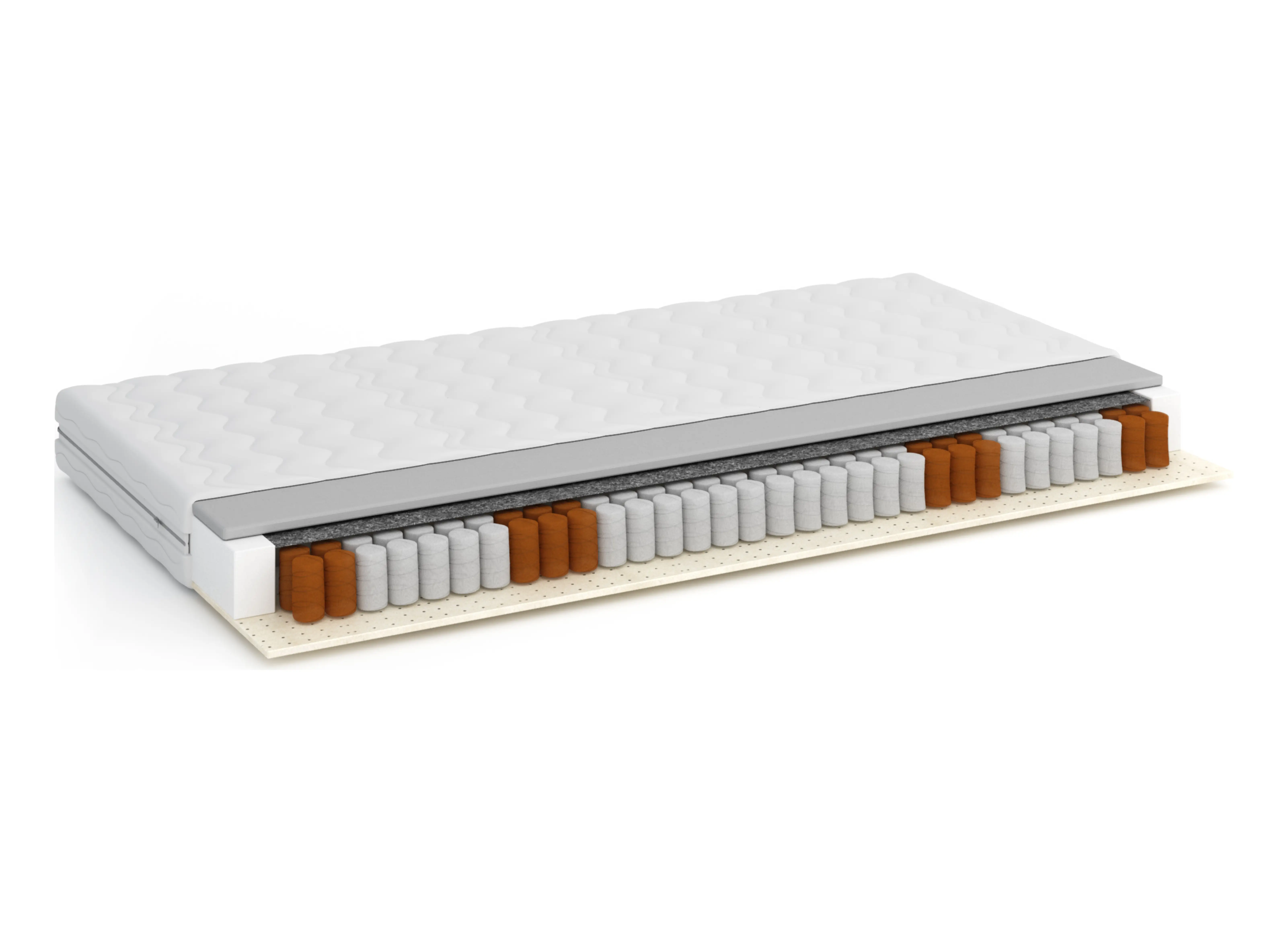 | Fyllning | Högelastiskt skum – 3 cm, Filt, Pocketfjädrar – 12 cm, Filt, Latexskum – 2 cm, Överdrag – 1 cm |