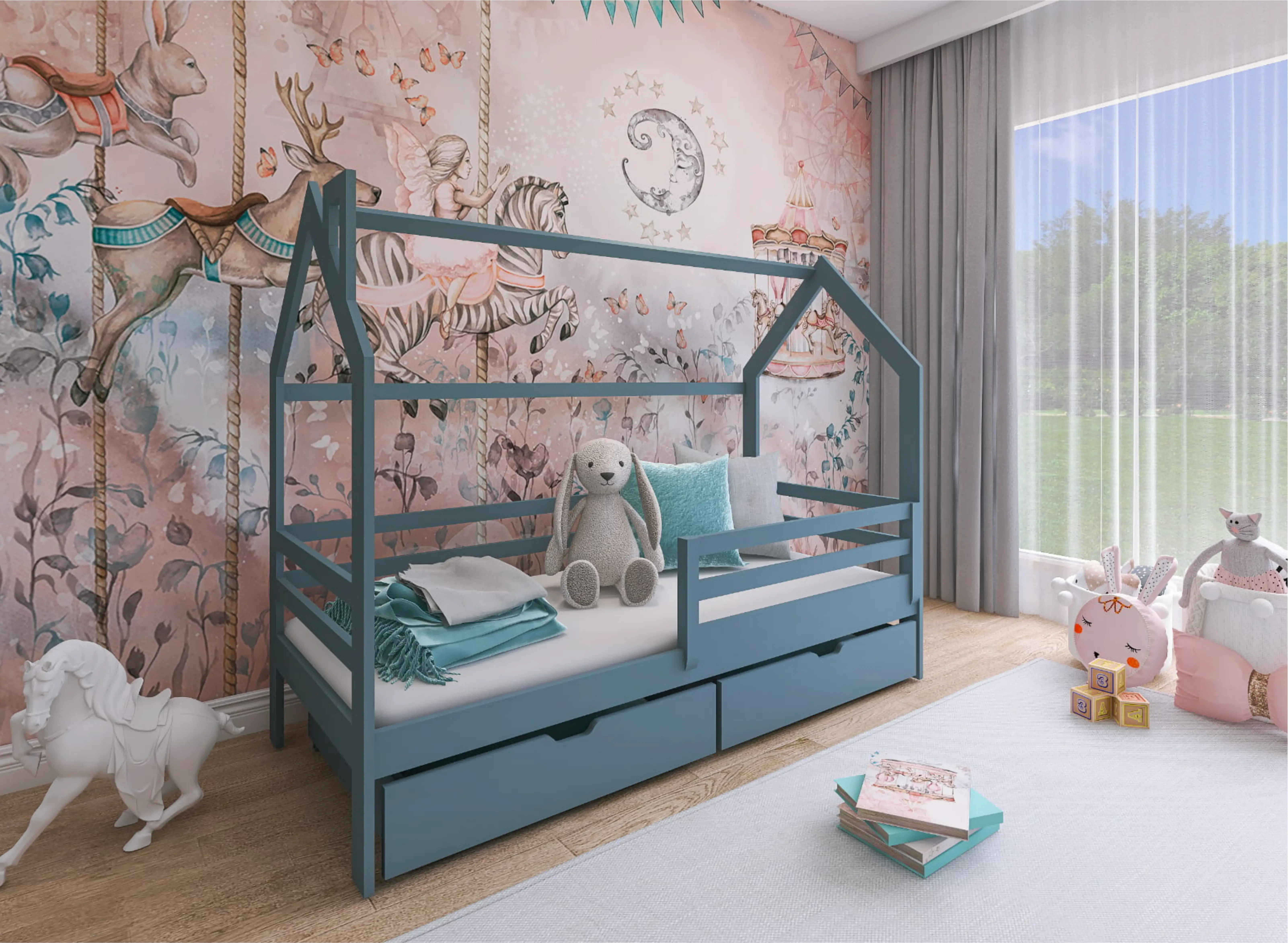 Hos Lano Meble bryr vi oss om ditt barns säkerhet och hälsa, därför tillverkas våra barnsängar av naturligt furuträ och målas med certifierade färger. Vi vet att en god natts sömn är grunden för varje barns utveckling. I våra möbler hittar du endast material av högsta kvalitet. Se vad LILA hussäng har att erbjuda och vilka dess största fördelar är. Stommen i LILA hussäng är helt tillverkad av furu. Upptill finns en träram som till formen påminner om ett tak, och nedtill finns en ribbotten av björk för madrassen. Du har även tillgång till två rymliga lådor, som fungerar som praktisk förvaring för sängkläder och leksaker. Tack vare vår LILA hussäng får du extra utrymme i barnrummet.