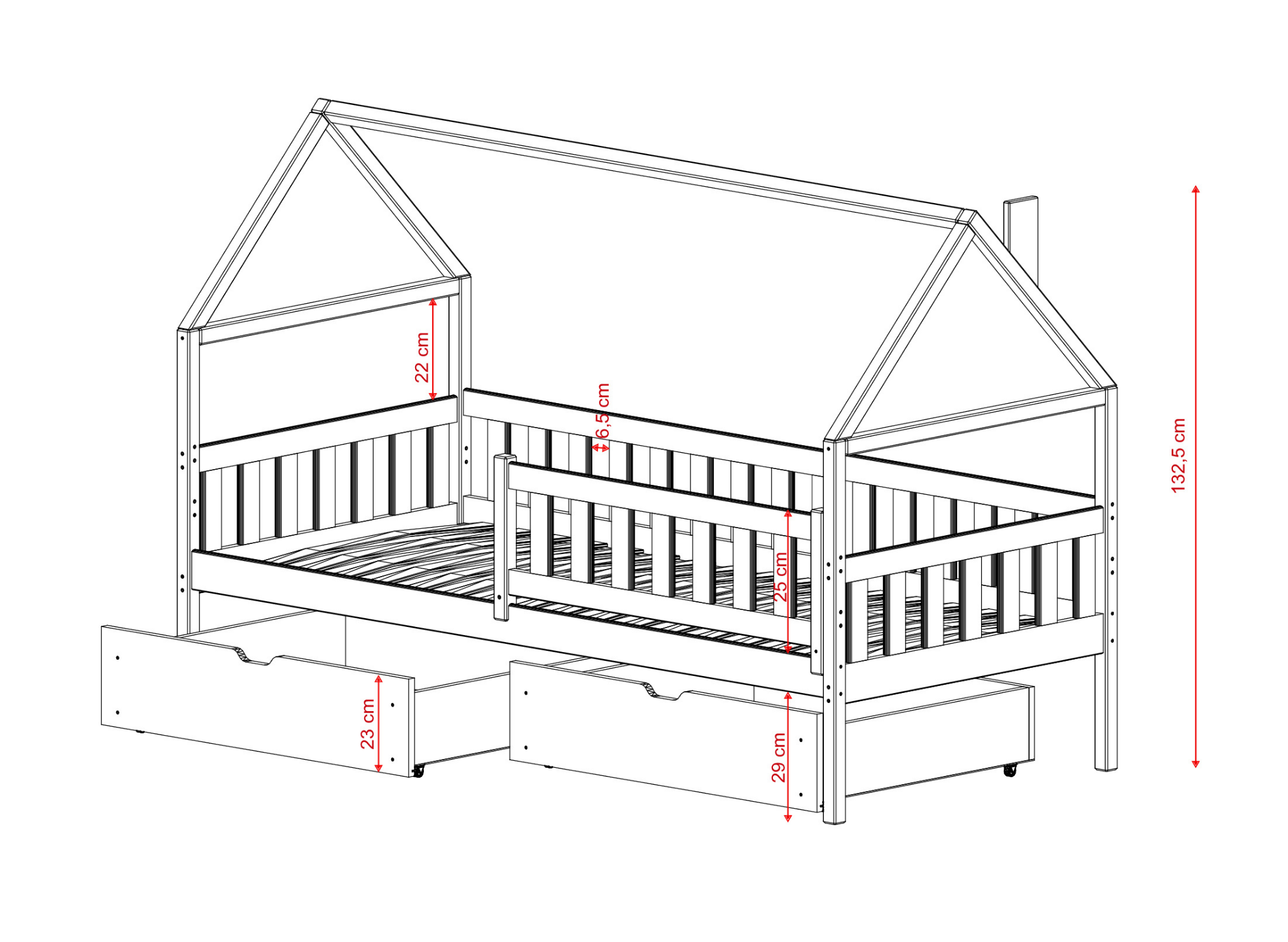 Drömmer man vackrare i en vacker miljö? Testa teorin i praktiken genom att inreda barnrummet med den söta hussängen DOMI. Det är inte bara det visuella som talar för modellen DOMI. Se vad mer denna barnmöbel har att erbjuda. Kanterna på DOMI-sängen från Lano Meble är utrustade med ett skyddsräcke som förhindrar att barnet ramlar ur sängen under livliga drömmar. Möbeln står dessutom på låga ben, vilket gör att barnet själv kan klättra i och ur utan föräldrahjälp. Den solida konstruktionen tål en belastning på upp till 100 kg, så barnsängen håller även om du vill lägga dig en stund hos din ögonsten.