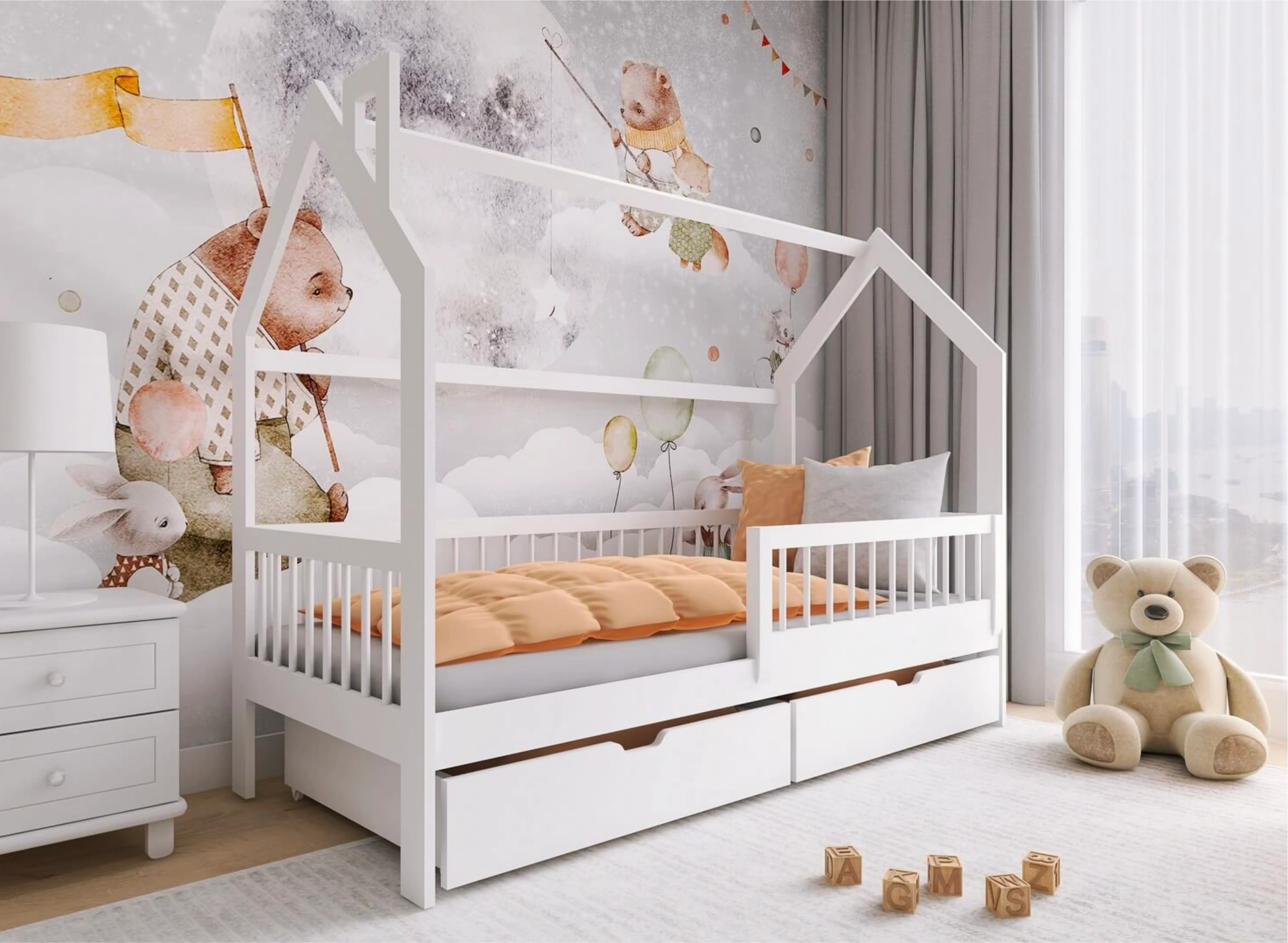 Barnsängen OSKAR är en möbel för barnrummet som livar upp inredningen och ger ditt barn en god natts sömn. Dess universella design passar perfekt in i alla inredningsstilar, och det charmiga utseendet tilltalar både flickor och pojkar. Hussängen OSKAR är en sann dröm som går i uppfyllelse, med en stil hämtad direkt från Disneys sagovärld. Varje barn drömmer om en bekväm sovplats som ger energi efter en hel dag av lek och lärande. Detta är möjligt tack vare en bekväm ribbotten och en väl vald madrass. Barnsängen OSKAR ger inte bara en säker och lugn sömn – den lockar också fram ett leende varje gång man ser den! Dessutom erbjuder hussängen OSKAR ännu fler möjligheter. Nedtill finns två rymliga lådor som hjälper dig att organisera utrymmet ännu bättre.