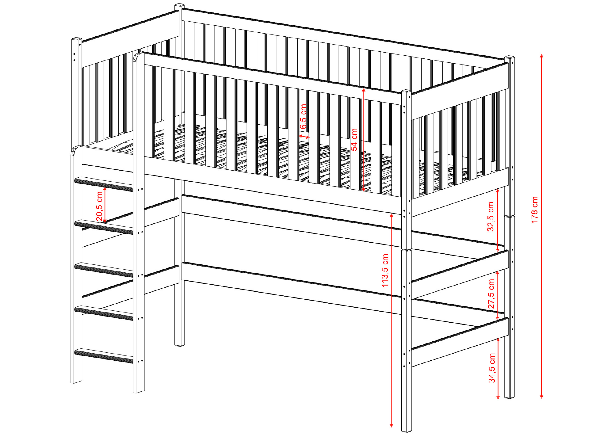 Möt hennes majestät LAURA – Den fantastiska 80x200 askfärgade mezzaninsängen LAURA är en unik lösning som kommer att variera inredningen i ett barnrum. Dess design, älskad av barn, är inte den enda fördelen med denna möbel. Läs mer! Mezzaninsängen är en platsbesparande lösning, vilket gör den perfekt för ett litet barnrum. Du kan arrangera den nedre delen på ett extremt praktiskt sätt – det är den perfekta platsen att organisera en leksakshörna, placera mjuka puffar för avkoppling eller skapa en hemmabas som hjälper till att hålla rummet snyggt. Barnsängens kant är avslutad med ett högt räcke som förhindrar fall. En ergonomisk stege med bekväma, stabila trappsteg säkerställer säker istigning.