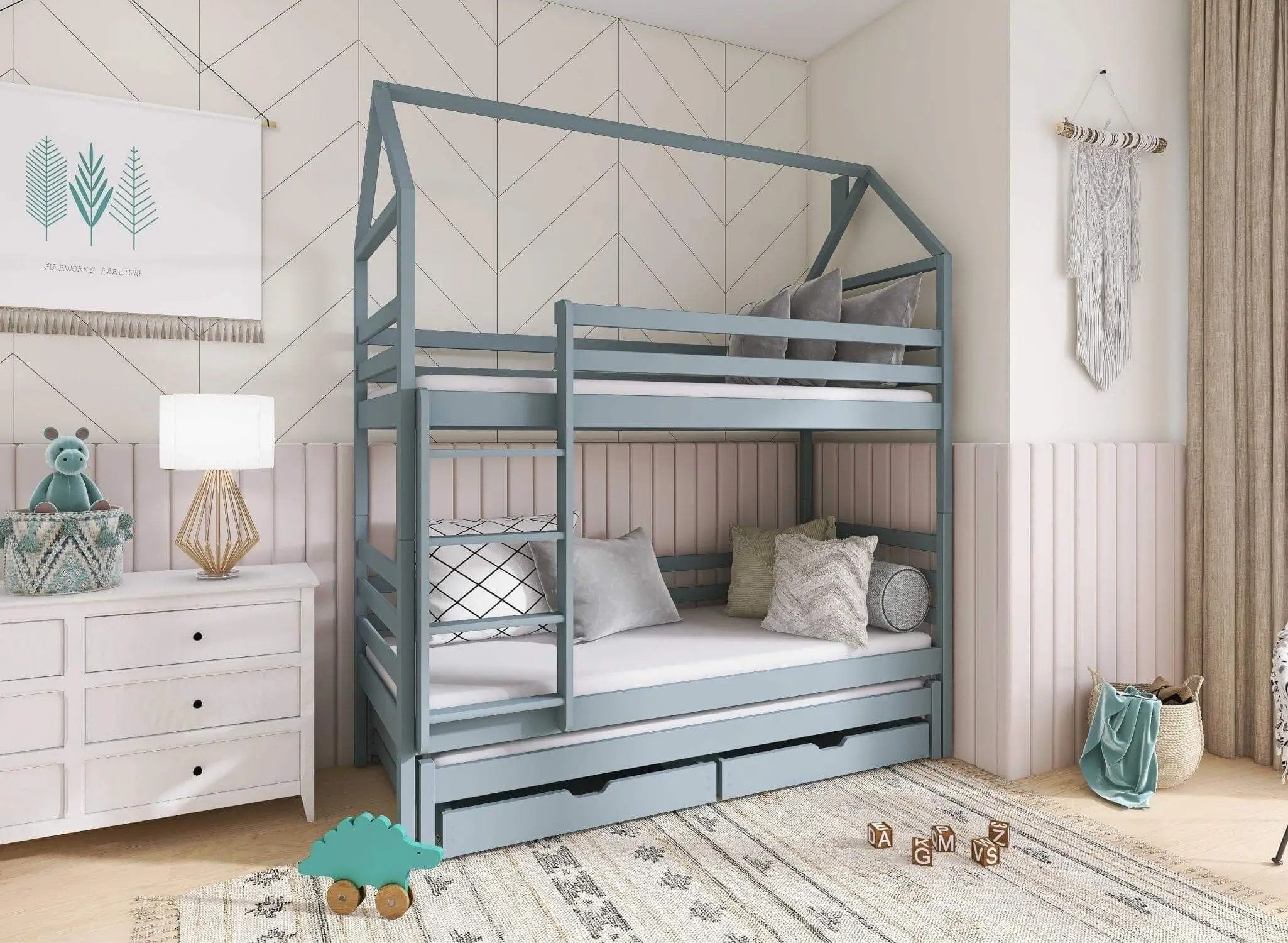 DALIA hussäng våningssäng är inte bara en bra idé för att inreda ett litet barnrum, utan också en plats för kreativ lek. På tal om lek – om du saknar plats för spel, leksaker eller andra barngrejer, har DALIA hussäng en lösning för dig. Möbeln har två rymliga förvaringslådor som hjälper till att hålla ordning i rummet.