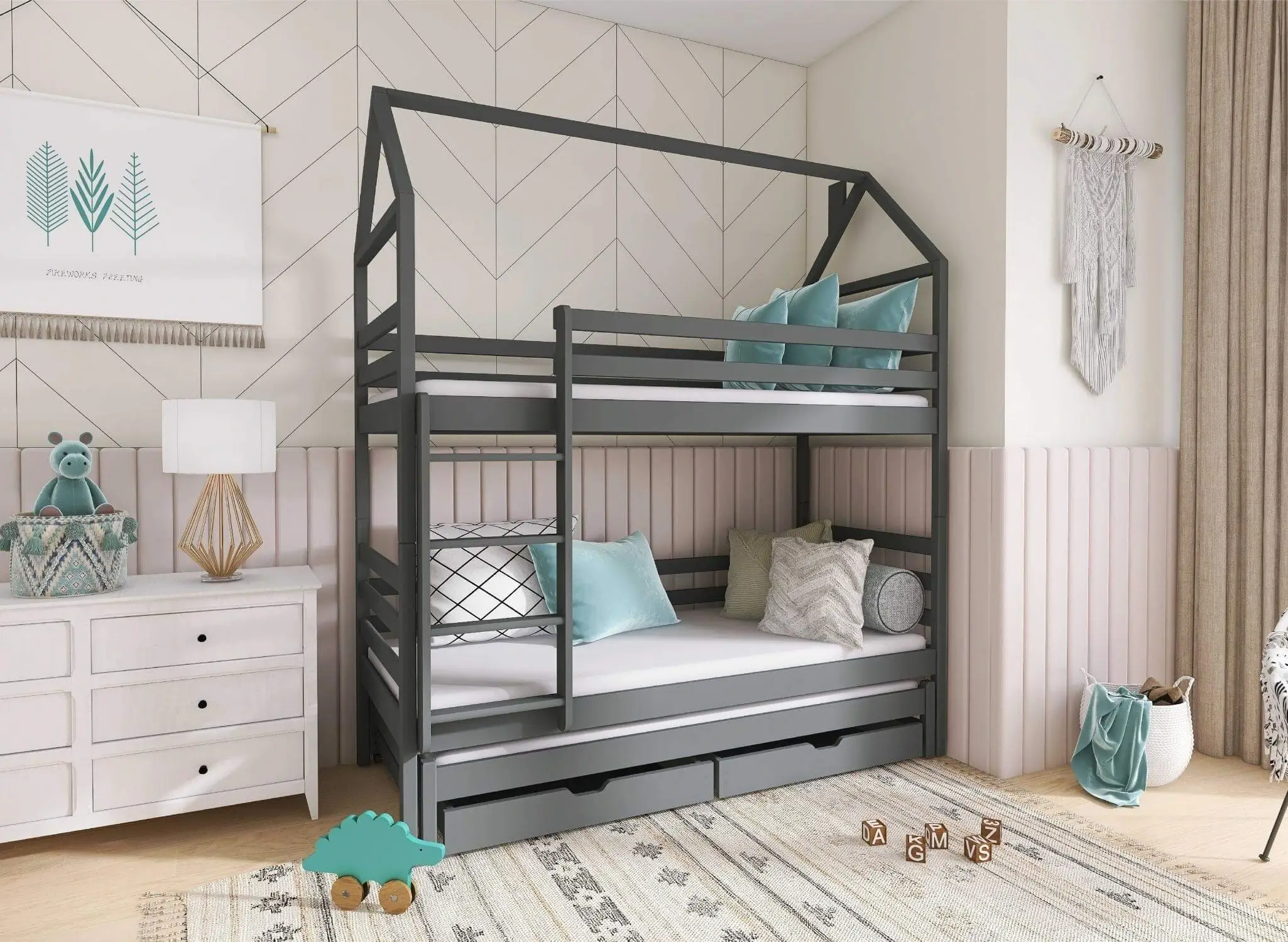 Upptäck den grafitgrå våningssängen DALIA 80x160 i husform, och du kommer inte att titta på någon annan