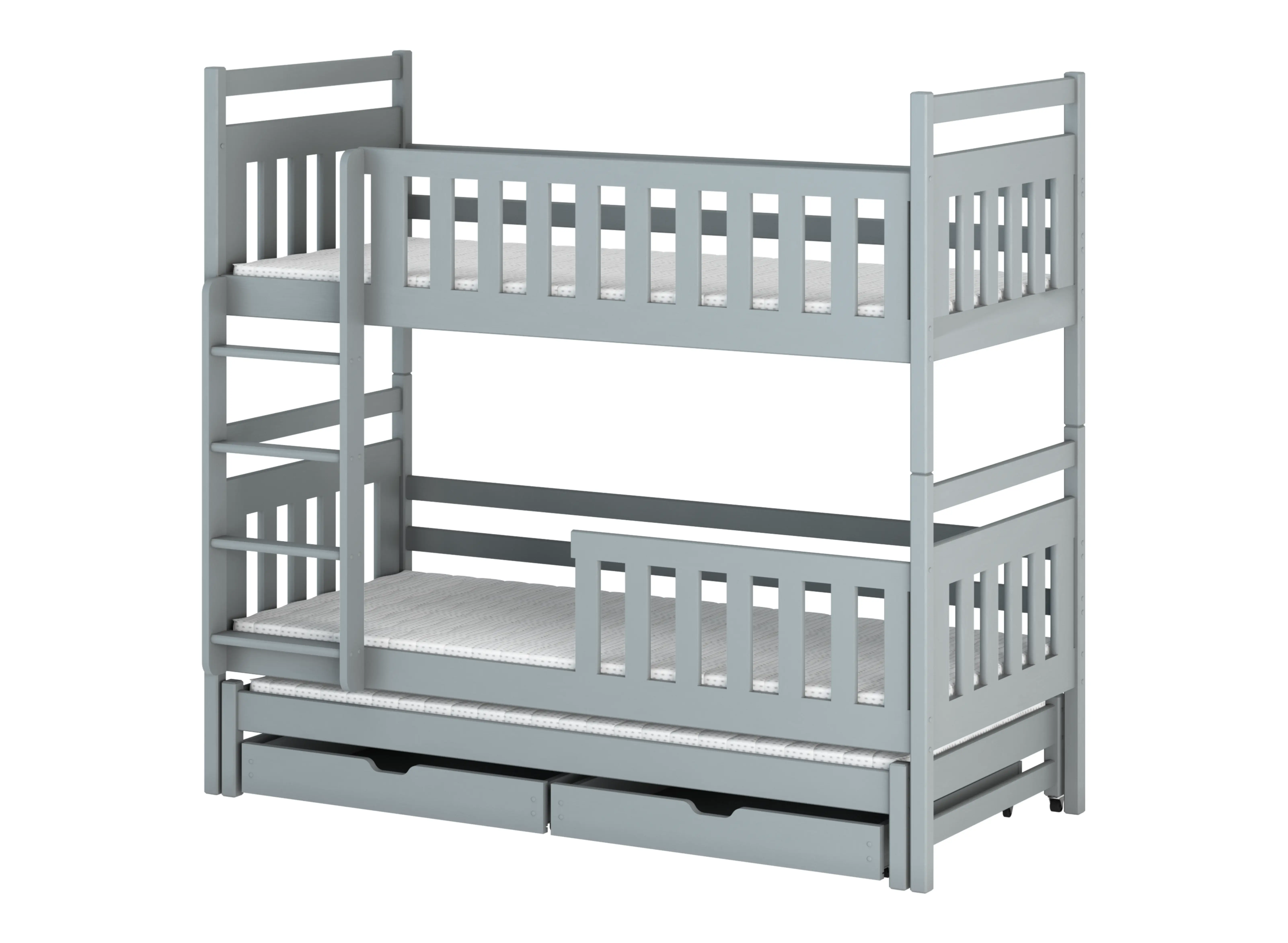 KLARA våningssäng från Lano Meble tillverkas med omsorg om varje liten detalj. Materialen vi använder håller högsta kvalitet, eftersom vi vill ge ditt barn en hälsosam och lugn sömn. KLARA våningssäng är ett intressant förslag för ett barnrum inrett i klassisk stil. Den klassiska ramen på KLARA våningssäng kommer att vara en intressant accent i dina barns kungarike. Furu skyddat med allergivänlig färg säkerställer hållbarheten hos KLARA våningssäng under många år framöver. KLARA är en våningssäng för tre personer som uppfyller behoven hos även de mest krävande småbarnen. Skyddsräcken finns i två versioner – fast monterade eller avtagbara. Det senare alternativet gör att du kan ta bort skyddsräcket under dagen när barnen bara vill leka. Du kan sätta tillbaka det till natten så att ditt barn sover säkert. I KLARA våningssäng finns också plats för en bekväm madrass på den utdragbara nivån. Detta är en smart lösning när du har barn i liknande åldrar eller ofta tar emot gäster.