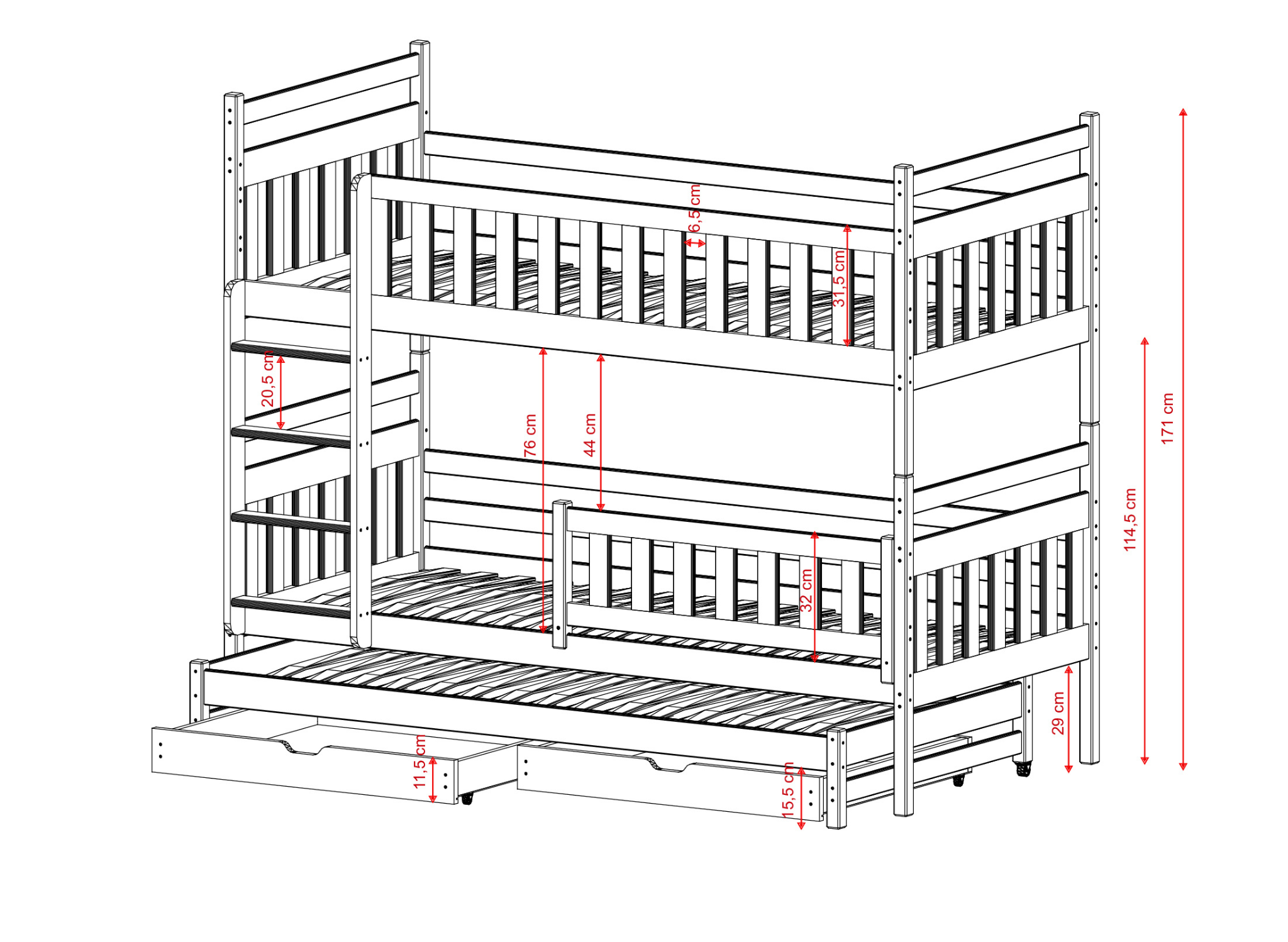 KLARA våningssäng från Lano Meble tillverkas med omsorg om varje liten detalj. Materialen vi använder är av högsta kvalitet, eftersom vi vill ge ditt barn en hälsosam och lugn sömn. KLARA våningssäng är ett intressant förslag för ett barnrum inrett i klassisk stil. Den klassiska ramen på KLARA våningssäng kommer att bli en intressant accent i dina barns rike. Furu skyddat med allergivänlig färg garanterar att KLARA våningssäng håller i många år. KLARA är en våningssäng för tre personer som uppfyller behoven även hos de mest krävande småbarnen. Skyddsräcken finns i två versioner – fast monterade eller avtagbara. Det senare alternativet gör att du kan ta bort räcket under dagen när barnen bara vill leka. Du kan sätta tillbaka det för natten så att ditt barn är säkert under sömnen. I KLARA våningssäng finns även plats för en bekväm madrass på den utdragbara sängdelen. Det är en smart lösning när du har barn i liknande ålder eller när du ofta har gäster.