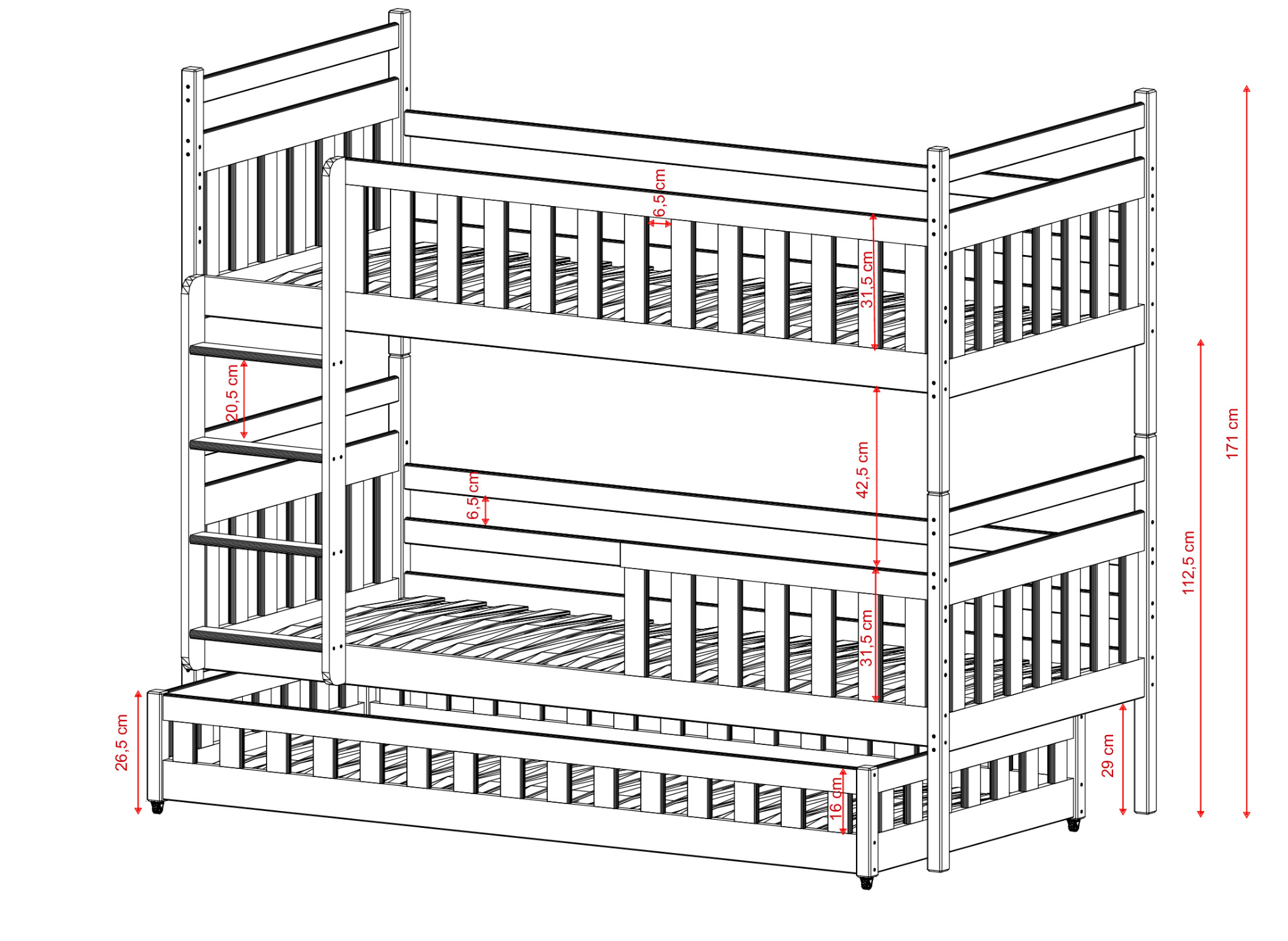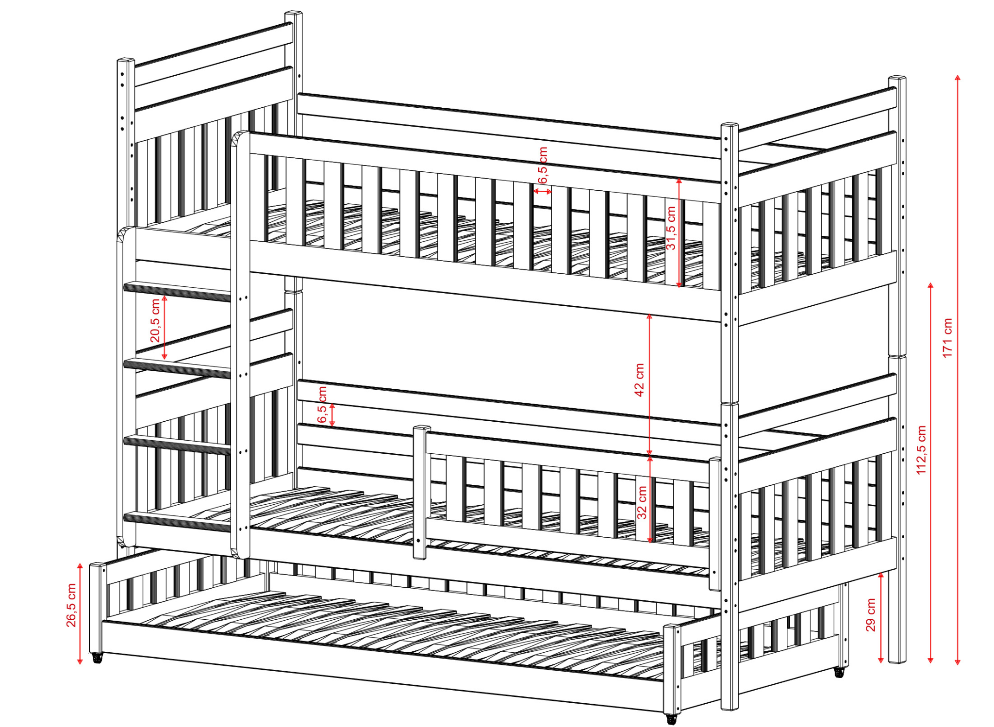 Har du tre barn som delar ett barnrum? Letar du efter praktiska lösningar? Om så är fallet har vi precis vad du söker. Vår våningssäng OLIWIA kombinerar två lösningar, vilket gör att den rymmer tre barn. OLIWIA syskonsäng är en våningssäng som har en dold, utdragbar och oberoende tredje säng i den nedre delen. När du väljer vår OLIWIA våningssäng bestämmer du själv hur de säkra räckena ska monteras, samt den viktiga parametern typ av madrass. Tack vare denna anpassning kan du enkelt matcha våningssängen OLIWIA inte bara efter barnens ålder, utan även efter deras krav och fysiska behov.