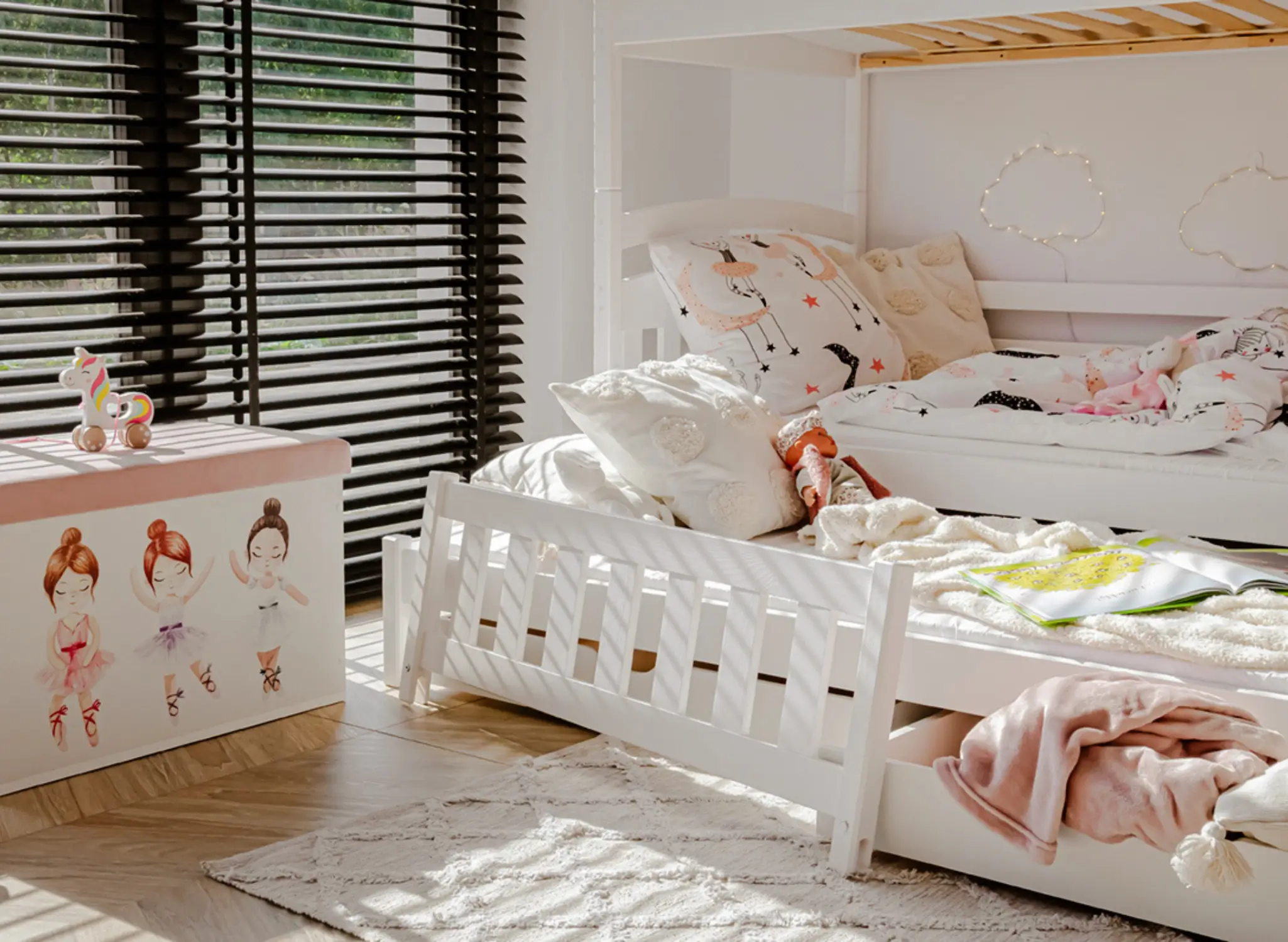 Längst ner på den trevåningsvåningssängen BLANKA kan det finnas utdragbara lådor, om du väljer det alternativet. Deras rymliga interiör rymmer många saker som annars rör till det i barnrummet, t.ex. leksaker som inte använts på länge eller filtar som bara används på vintern. Den extra, utdragbara madrassen längst ner blir ovärderlig när barnet bjuder hem vänner på övernattning – den ger gästerna komfort utan behov av extra luftmadrasser.