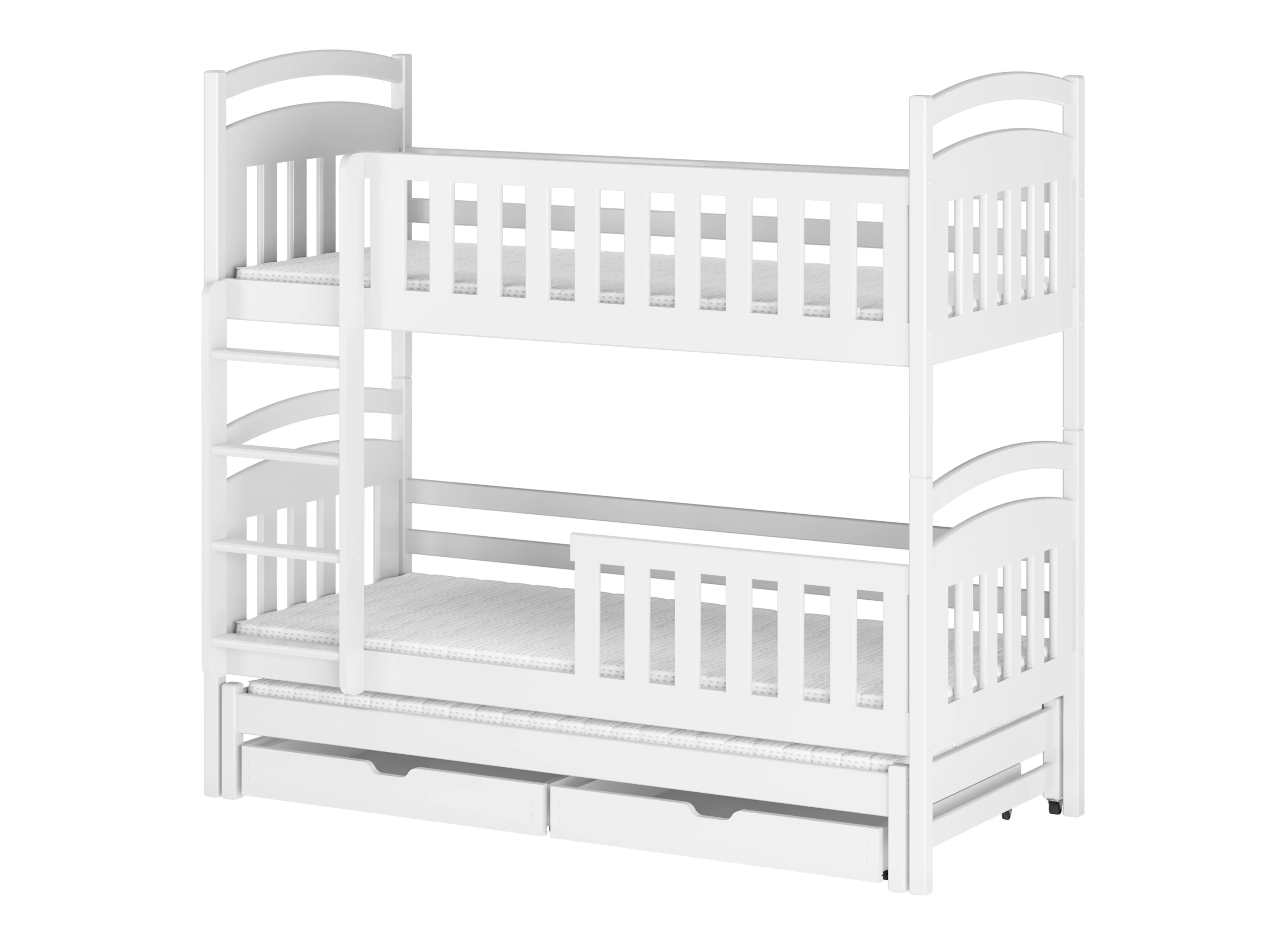 Våningssängen VIKI är tillverkad av furu. Det är ett material som är hållbart, motståndskraftigt mot mekaniska skador och tål hög belastning. Konstruktionen på VIKI syskonsäng är därför extremt solid. Dessutom erbjuder sängen möjligheten att köpa till lådor, som ger extra förvaringsutrymme för exempelvis sängkläder eller leksaker.