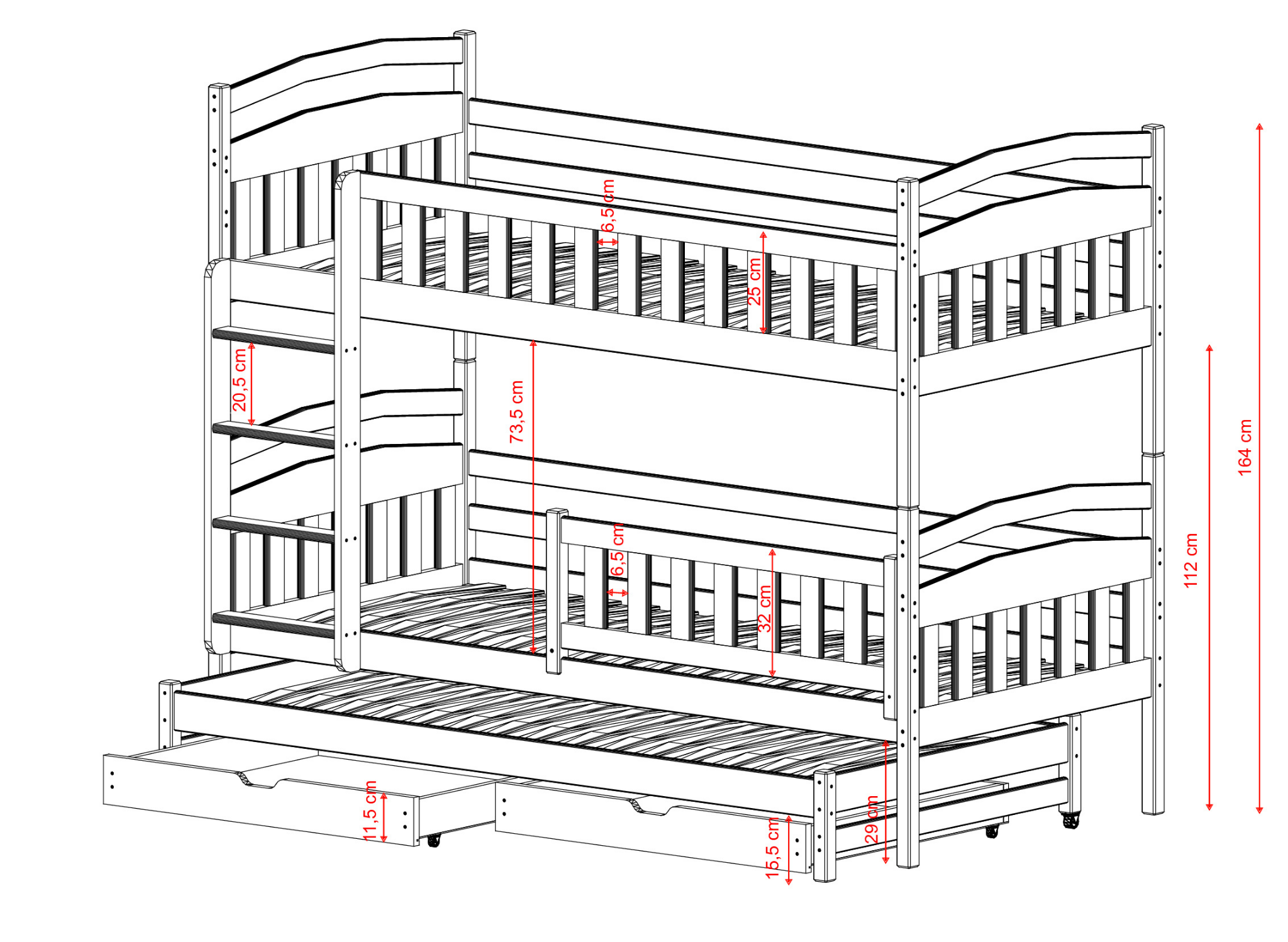 Längst ner på tretals-våningssängen BLANKA kan det finnas utdragbara lådor, om du väljer det alternativet. Deras rymliga inre rymmer många saker som annars tar upp plats i barnrummet, t.ex. leksaker som inte används så ofta eller filtar som bara behövs på vintern. Den extra, utdragbara madrassen längst ner blir en ovärderlig hjälp när barnet bjuder in vänner på övernattning – det ger gästerna komfort utan att man behöver ta fram extra luftmadrasser.