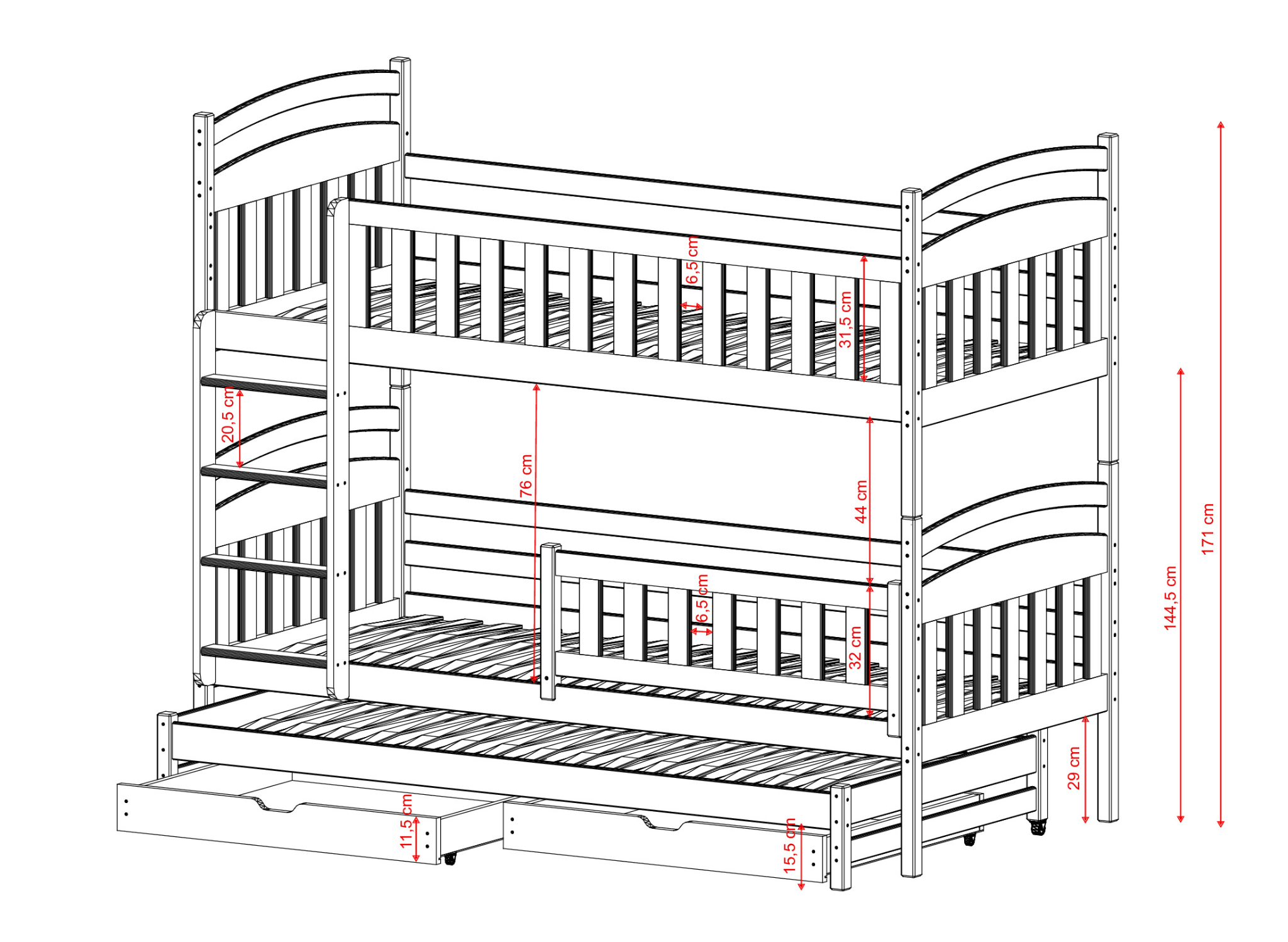VIKI våningssäng är tillverkad av furu. Det är ett material som är hållbart, motståndskraftigt mot mekaniska skador och hög belastning. Konstruktionen av VIKI syskonsäng är därför extremt solid. Dessutom erbjuder sängen möjligheten att köpa till lådor, som utgör extra förvaringsutrymme för exempelvis sängkläder eller leksaker.