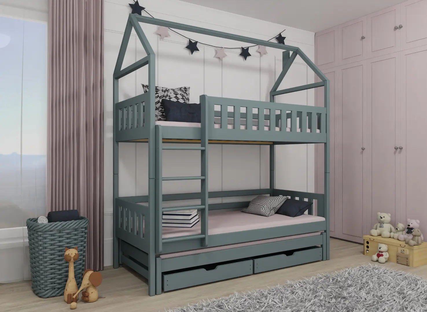 IGA våningssäng husmodell kan utrustas med två rymliga lådor för förvaring av sängkläder, kläder, leksaker eller andra barntillbehör. Tack vare denna lösning sparar du mycket plats och ser till att barnrummet förblir prydligt och välororganiserat. Kom ihåg att när du väljer IGA våningssäng husmodell, tillverkas förvaringslådorna i en kombination med spånskiva.