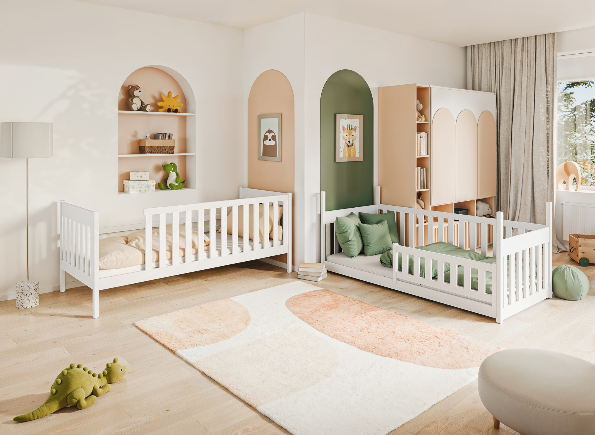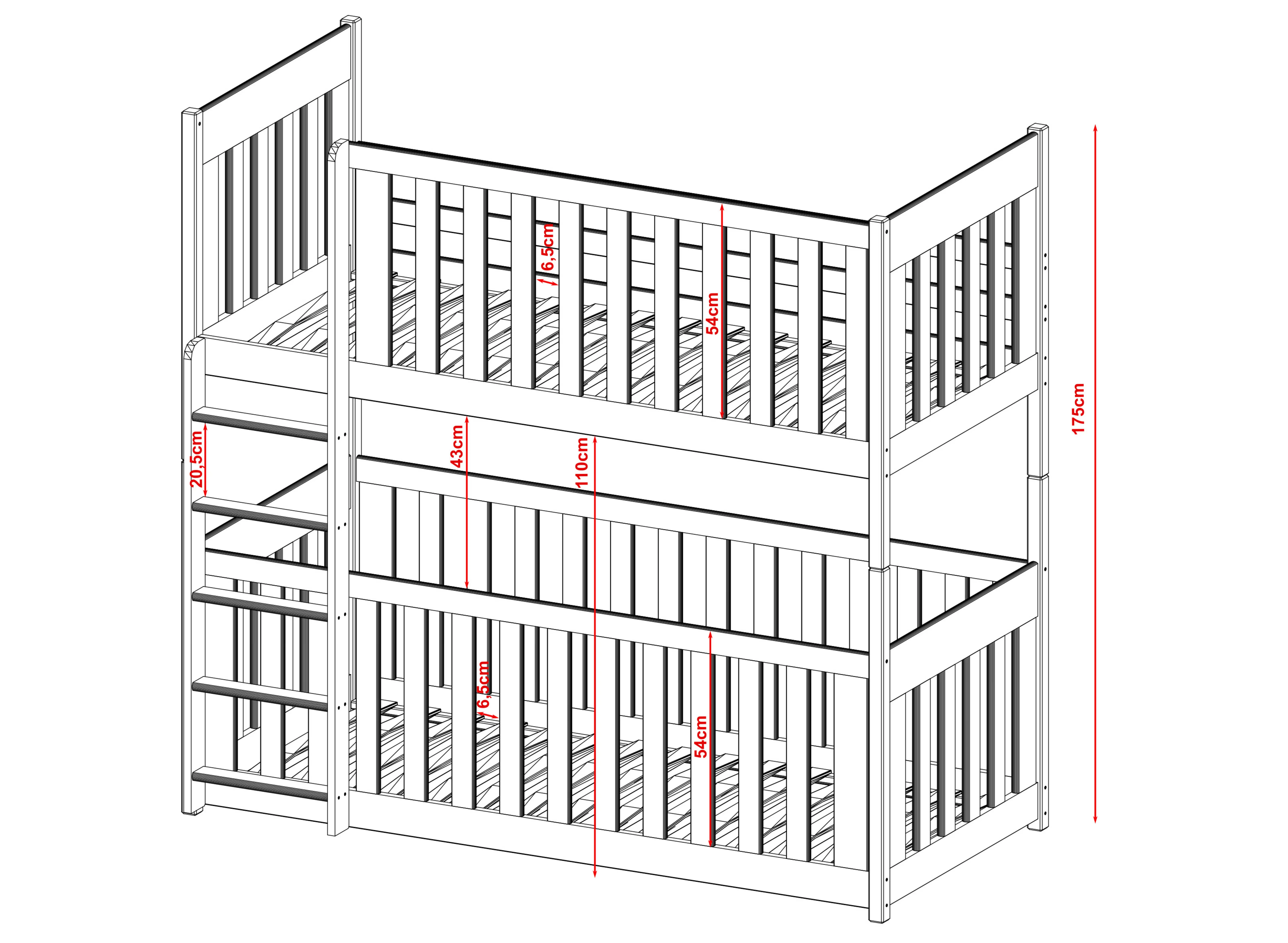 KONRAD våningssäng är unik och hjälper dig att skapa en oslagbar atmosfär i barnrummet. De höga skyddsräckena fungerar inte bara som säkerhet under sömnen, utan kan också vara en fantastisk dekorationsyta. Träräckena på KONRAD-sängen kan dekoreras med ljusslingor eller pappersfigurer gjorda av dina barn. I ett sådant inrett rum kommer dina barn att känna sig hemma, allt tack vare våningssängen KONRAD. En av de viktigaste egenskaperna hos KONRAD våningssäng är de höga skyddsräckena. Du kan välja mellan flera typer: fullständiga räcken, avtagbara, ¾ eller ½. Oavsett vilket alternativ du väljer, ger de ditt barn trygghet under sömnen. För något äldre barn kan du även välja KONRAD barnsäng utan räcken. Tillsammans med möbeln får du också en bekväm stege med breda stegsteg, som gör det lättare för de små att klättra upp. Under monteringen av KONRAD våningssäng kan du själv bestämma på vilken sida ingången ska vara.