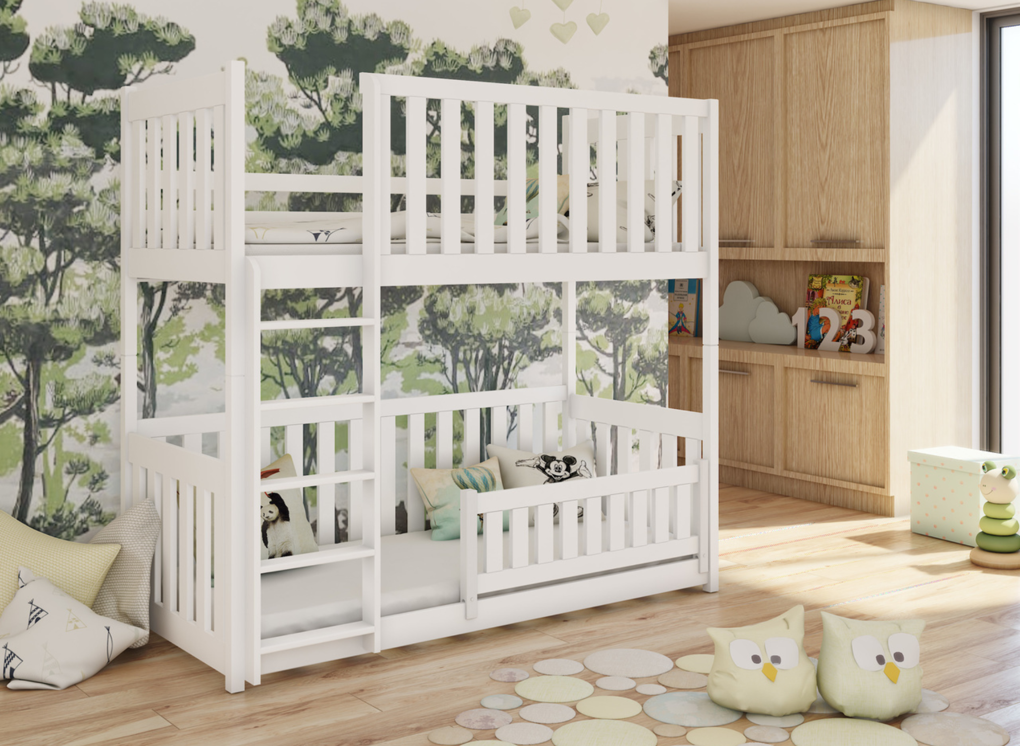 Våningssängen KONRAD är unik och hjälper dig att skapa en unik atmosfär i barnrummet. De höga skyddsräckena ger inte bara säkerhet under sömnen, utan kan även vara en utmärkt dekorationsyta. Träräcken på sängen KONRAD kan dekoreras med ljusslingor eller barnens egna pappersklipp. I ett sådant inrett rum kommer dina barn att känna sig trygga, tack vare KONRAD barnsäng. En av de viktigaste funktionerna hos KONRAD våningssäng är de höga skyddsräckena. Du kan välja mellan flera typer: fullständiga räcken, avtagbara, ¾ eller ½. Oavsett vilket alternativ du väljer, kommer de att ge ditt barn säkerhet under sömnen. För lite äldre barn kan du också välja KONRAD barnsäng utan skyddsräcken. I setet med möbeln får du också en bekväm stege med breda stegpinnar, vilket gör det lättare för barnen att klättra upp till den övre nivån. Vid montering av våningssängen KONRAD kan du bestämma vilken sida ingången ska vara på.