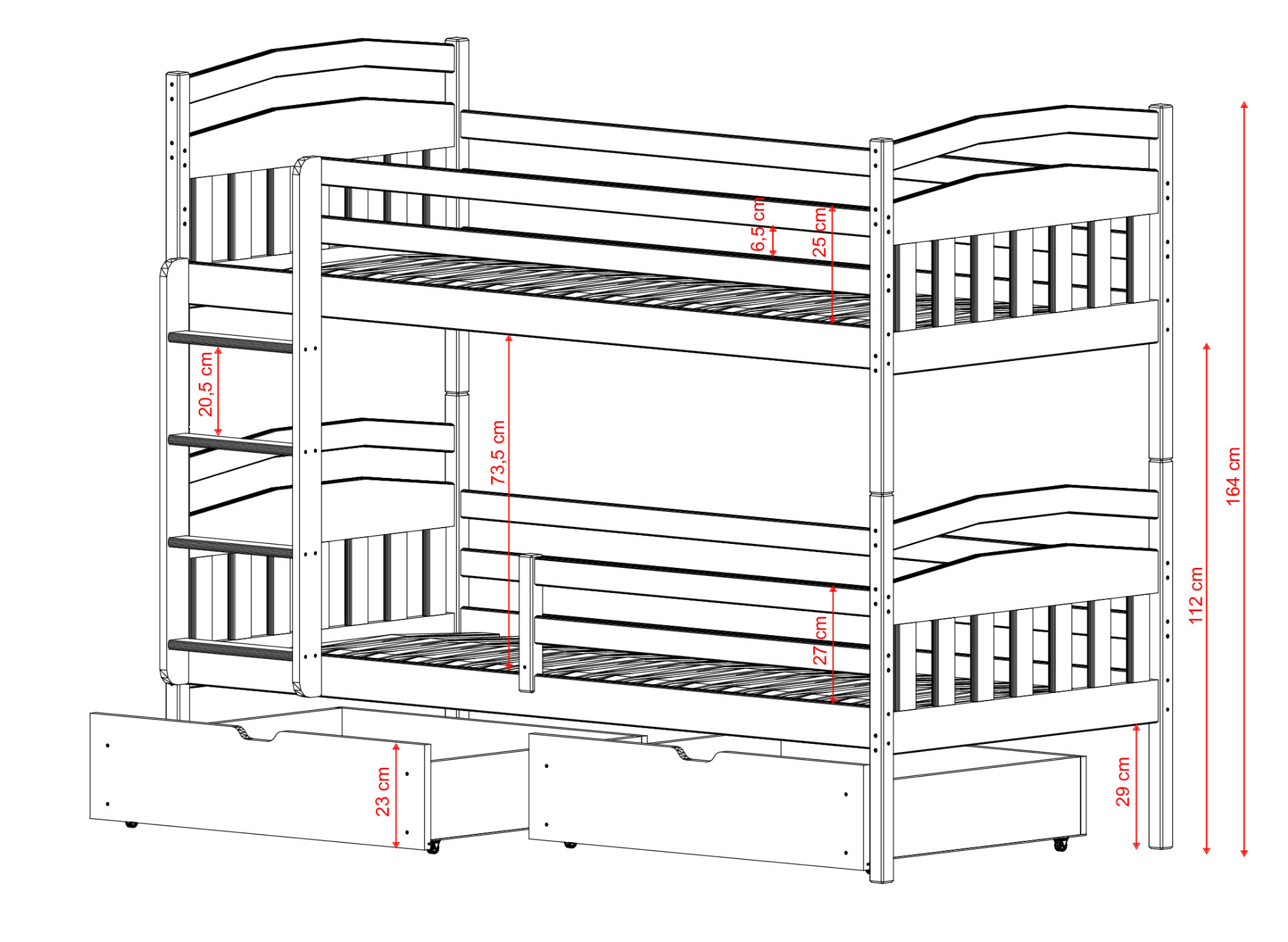 Vi erbjuder många möjligheter till personalisering av våningssängen GABI. Du kan välja tillval med extra lådor för sängkläder och leksaker, säkra och snygga skyddsräcken som kan monteras på båda sidor samt en bekväm stege. Vår barnsäng GABI kan också få ett höjt mellanrum med över 20 cm. Det viktigaste är dock möjligheten att välja övre och undre madrass enligt egna önskemål – det finns olika typer och storlekar tillgängliga. Sängen med lådor GABI kommer helt att förvandla barnrummet. Det är en av de bästa möblerna för två småbarn!
