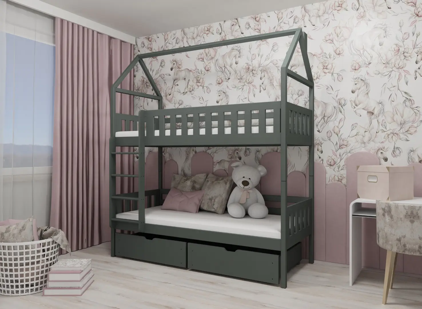 En dröm som går i uppfyllelse för både pojkar och flickor – grafitgrå GAJA våningssäng i husdesign 80x170