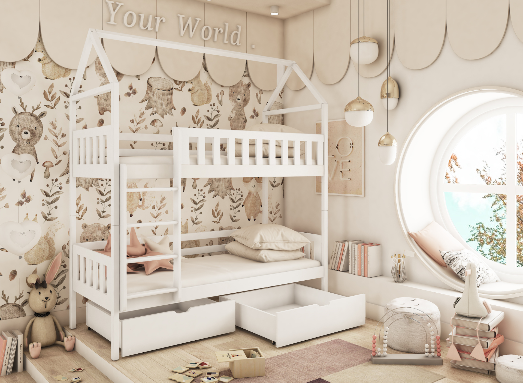 Förbättra vardagen – vit GAJA våningssäng i husform med lådor