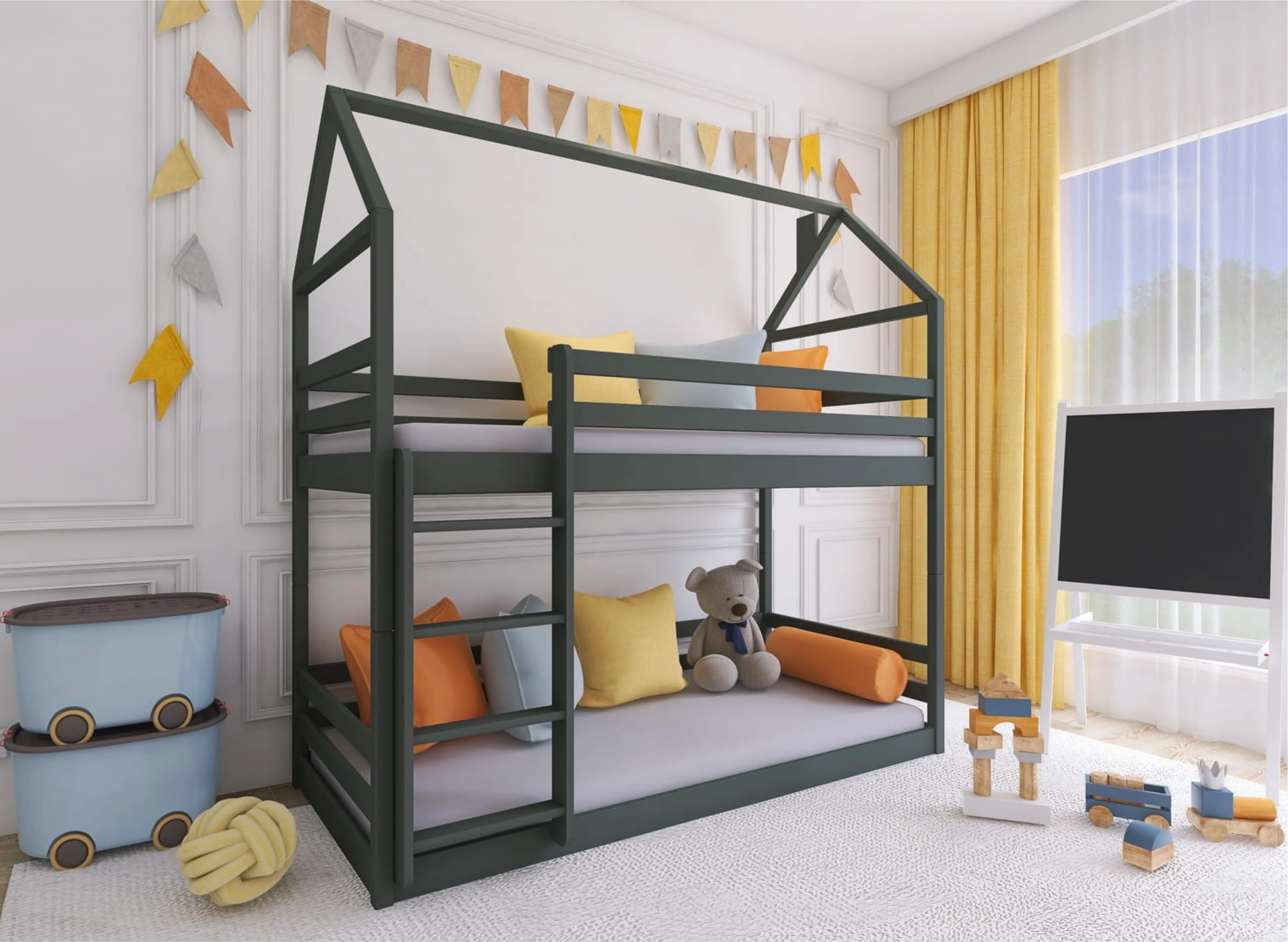 Håller du på att inreda ett barnrum för syskon? Våningssängen AXEL är ett utmärkt val. På Lano Meble älskar vi att uppfylla barns önskningar, och varje barn som delar sovrum med en bror eller syster drömmer i hemlighet om en unik säng som blir deras alldeles egna bas och fristad. AXEL, en våningssäng av hussängstyp, passar in i alla inredningar och sparar värdefull golvyta.