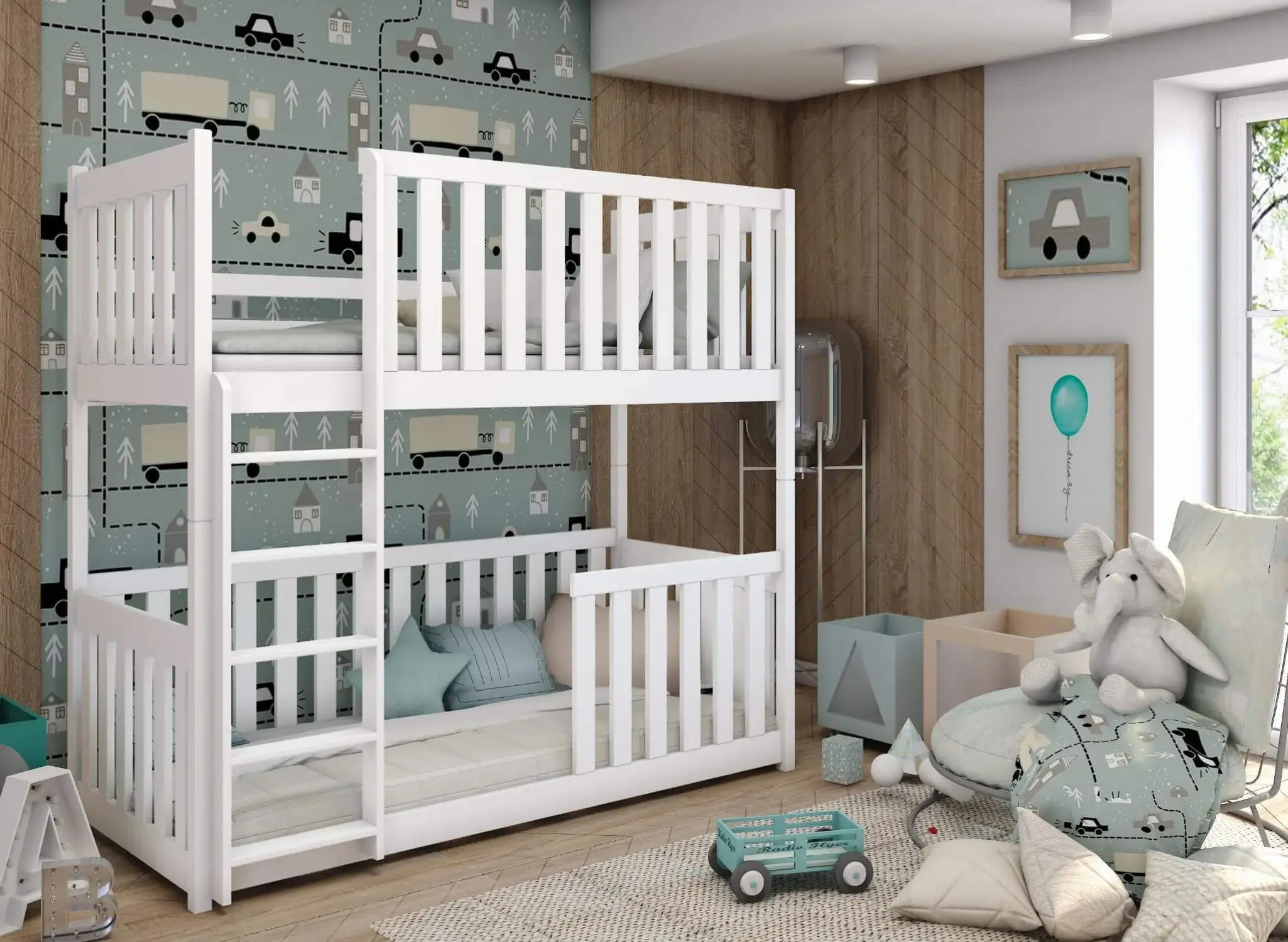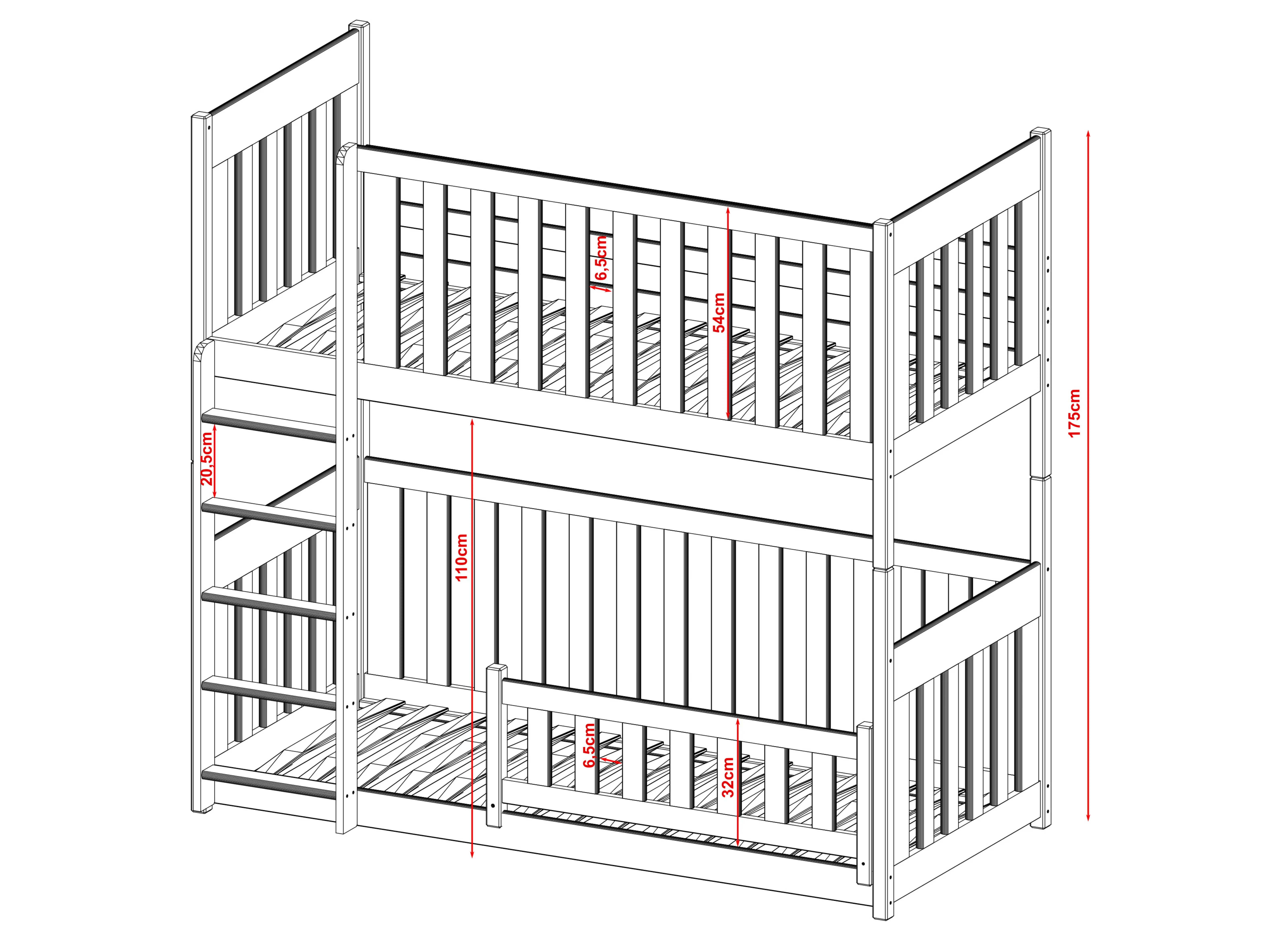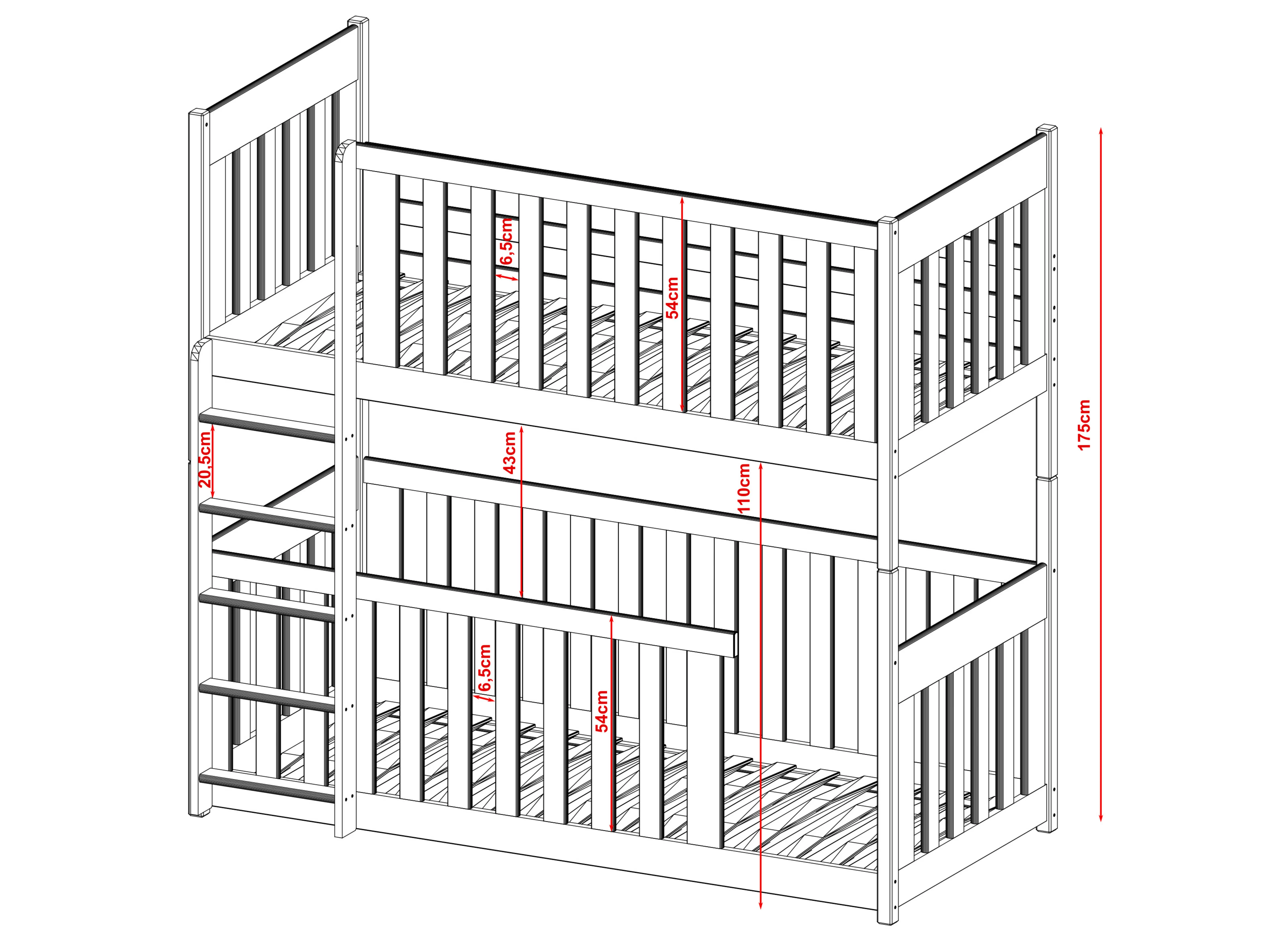 Våningssängen KONRAD är unik och hjälper dig att skapa en alldeles speciell atmosfär i barnrummet. De höga skyddsräckena garanterar inte bara säkerhet under sömnen, utan kan också fungera som en fantastisk dekorationsyta. Träräckena på KONRAD-sängen kan dekoreras med ljusslingor eller pappersfigurer som barnen skapat. I ett sådant barnrum kommer dina barn att känna sig trygga och fria. En av de viktigaste funktionerna hos våningssängen KONRAD är de höga skyddsräckena. Du kan välja mellan flera typer: fasta räckessidor, avtagbara, ¾ eller ½ längd. Oavsett vilket alternativ du väljer, garanterar de ditt barns säkerhet under natten. För lite äldre barn kan du även välja KONRAD barnsäng utan räcken. Tillsammans med möbeln får du också en bekväm stege med breda stegsteg, vilket gör det enkelt för de små att klättra upp till den övre våningen. Vid montering av KONRAD-våningssängen kan du själv bestämma på vilken sida stegen ska placeras.