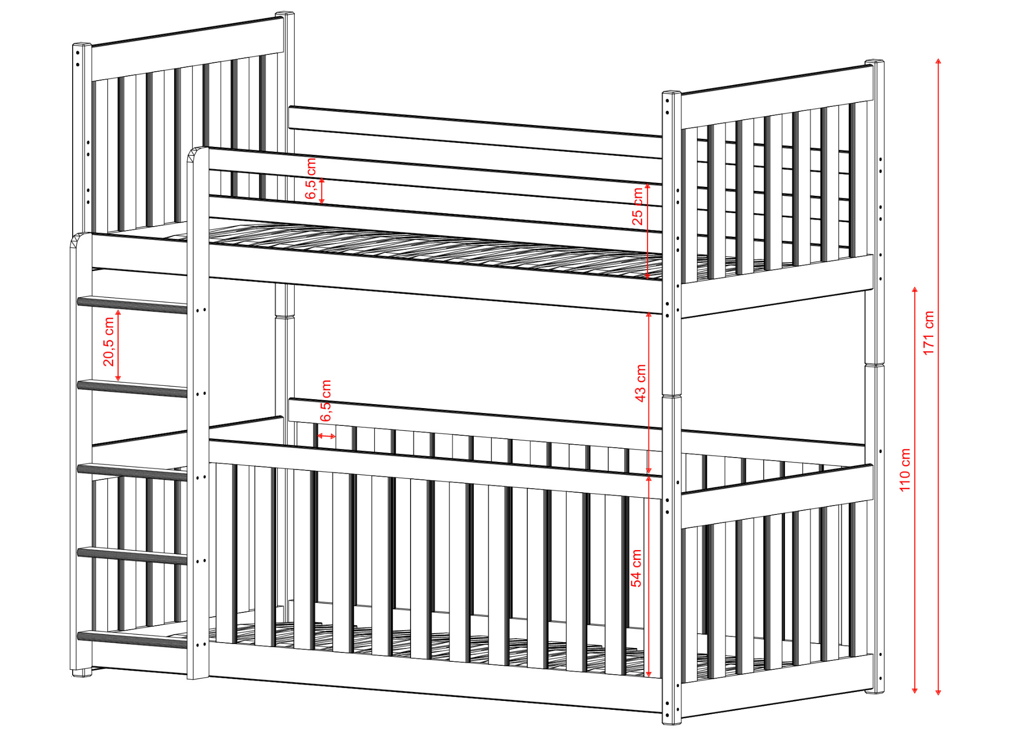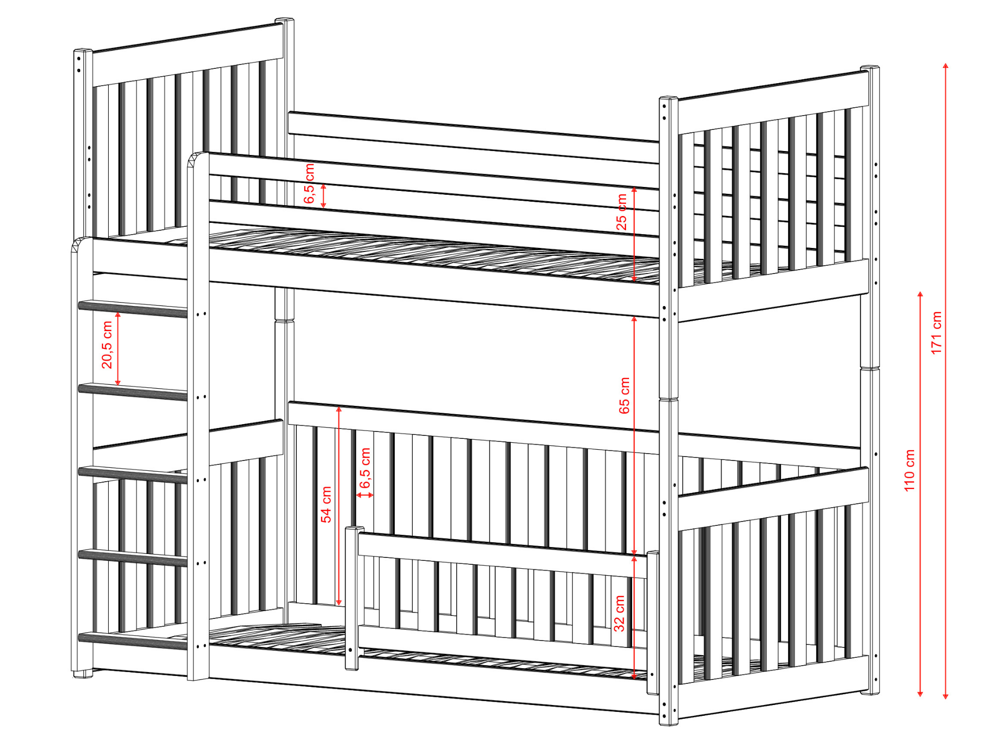 CRIS våningssäng är det perfekta förslaget för två barn. Vi har tillverkat möbeln av solid furu, vilket garanterar hållbarhet. CRIS barnsäng är en kombination av funktionalitet och vacker design. Vi har använt skyddsräcken i trä och en stabil stege – barnrummet kommer att få nytt liv med denna möbel. CRIS våningssäng erbjuder många konfigurationsalternativ. Du kan först och främst välja en av många madrasser för både under- och översäng. Det går även att modifiera frihöjden och skyddsräcket. Denna modell har verkligen många fördelar. Framför allt är CRIS våningssäng gediget byggd – den håller i åratal. Dessutom har vi utrustat den med praktiska skyddsräcken och en universell stege. Ditt barnrum kommer att få en unik atmosfär tack vare designen på denna våningssäng. Vår CRIS är synonymt med bekvämlighet och funktionalitet. Vi har sett till att möbelns konstruktion är solid och tagit hänsyn till en rad detaljer för att leverera en unik och extremt bekväm barnsäng till dina barn.