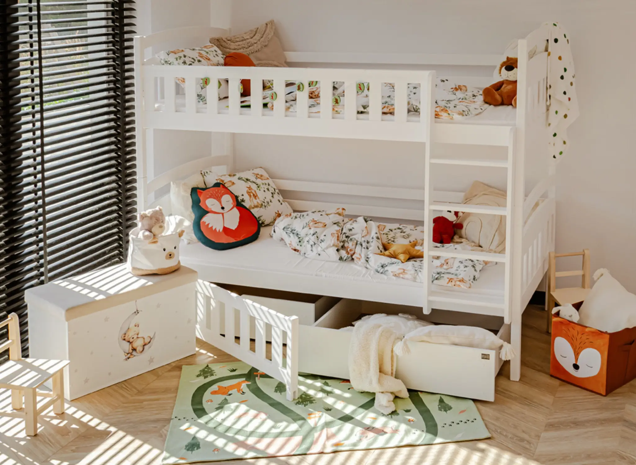 Man kan aldrig få för mycket förvaringsutrymme. Vi delar den uppfattningen, och därför är våra sängar inte bara vackra och robusta, utan även praktiska. När du beställer våningssängen IGNAŚ kan du välja till lådor som matchar i stil och karaktär. Deras bredd och höjd gör att du enkelt kan förvara barnens extra sängkläder där. Lådorna är utrustade med hjul, vilket underlättar utdragningen från under sängarna, medan de minimalistiska handtagen ger lådorna en elegant touch. Våningssängen IGNAŚ från Lano Meble är anpassad efter även de yngre barnens behov. Båda delarna av sängen har skyddsräcken i trä, så även de små som sover oroligt är säkra. Men det är inte allt – när dina barn blir äldre kan du snabbt montera bort skyddsräcket på den nedre delen för enklare insteg.