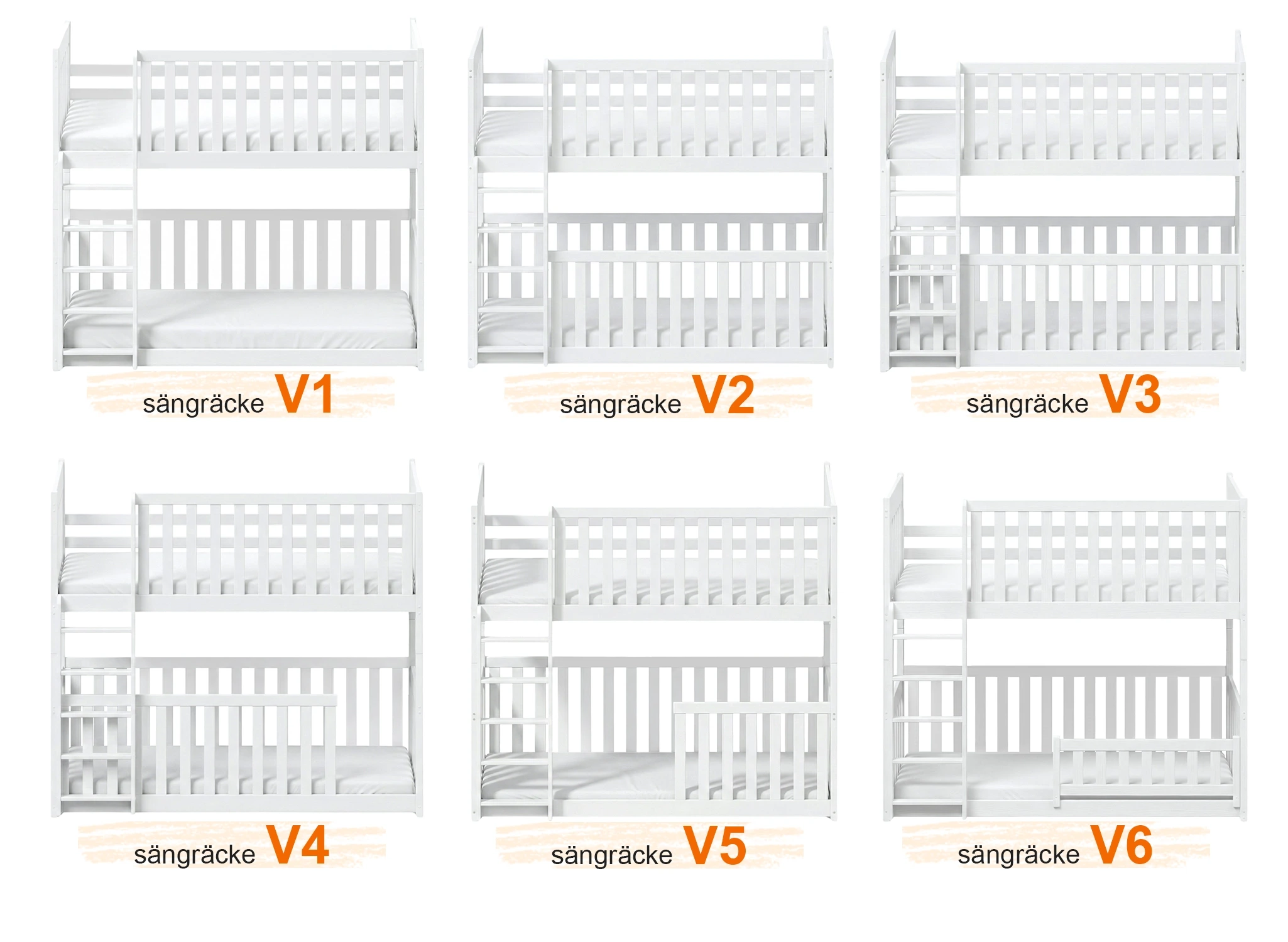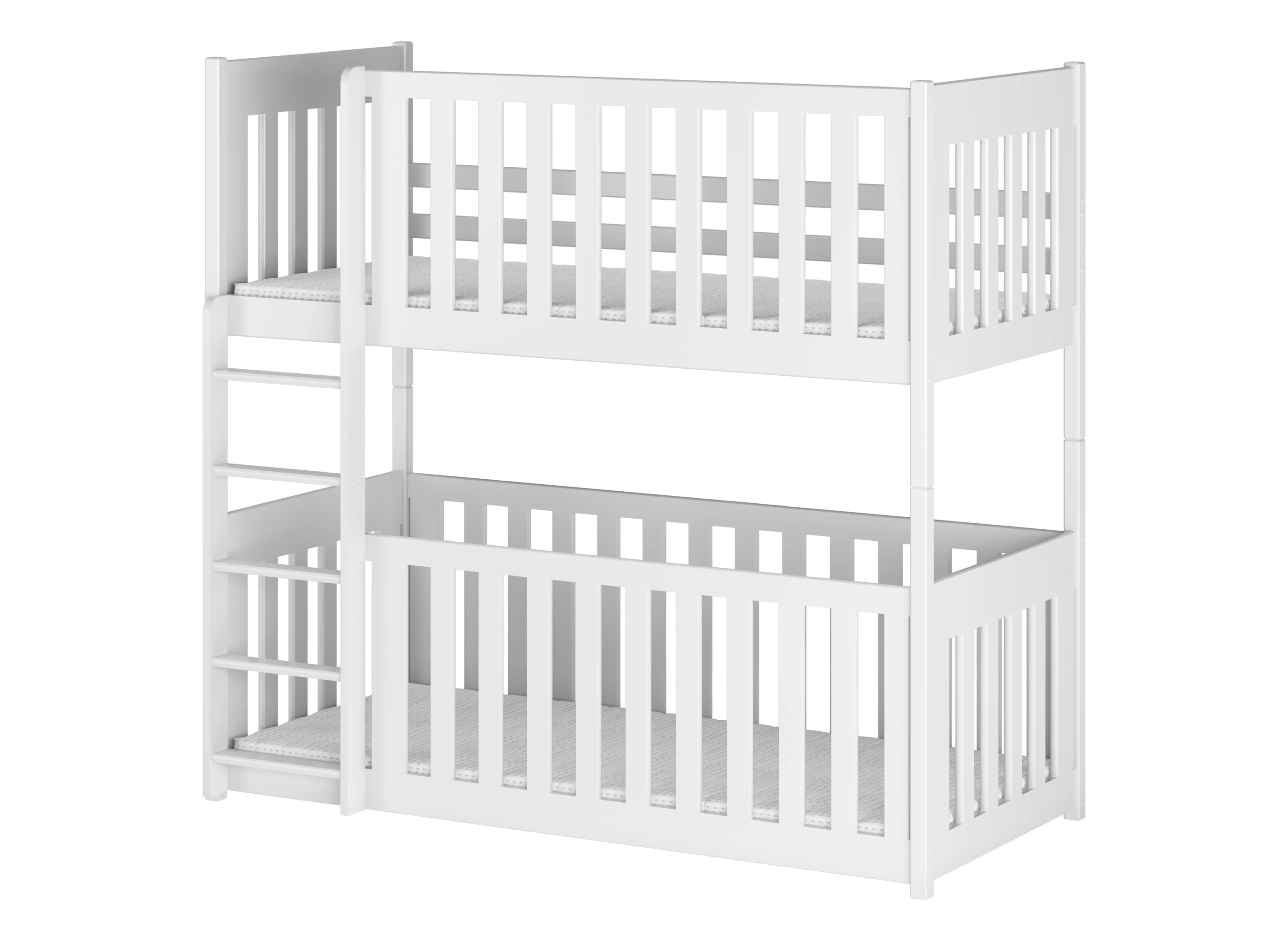Våningssängen KONRAD är unik och hjälper dig att skapa en oslagbar atmosfär i barnrummet. Höga skyddsräcken ger inte bara säkerhet under sömnen, utan kan också vara en utmärkt plats för dekoration. Träräcket på KONRAD-sängen kan dekoreras med ljusslingor eller pappersfigurer gjorda av dina småttingar. I ett sådant barnrum kommer dina barn att känna sig trygga, och allt tack vare KONRAD våningssäng för barn. En av nyckelfunktionerna hos våningssängen KONRAD är de höga skyddsräckena. Du kan välja mellan flera typer: fullständiga räcken, avtagbara, ¾ eller ½. Oavsett vilket alternativ du väljer kommer de att garantera ditt barns säkerhet under sömnen. För lite äldre barn kan du också välja KONRAD barnsäng utan räcken. Tillsammans med möbeln får du också en bekväm stege med breda stegpinnar som gör det lättare för barnen att klättra upp till den övre nivån. Vid montering av våningssängen KONRAD kan du själv bestämma på vilken sida ingången ska sitta.