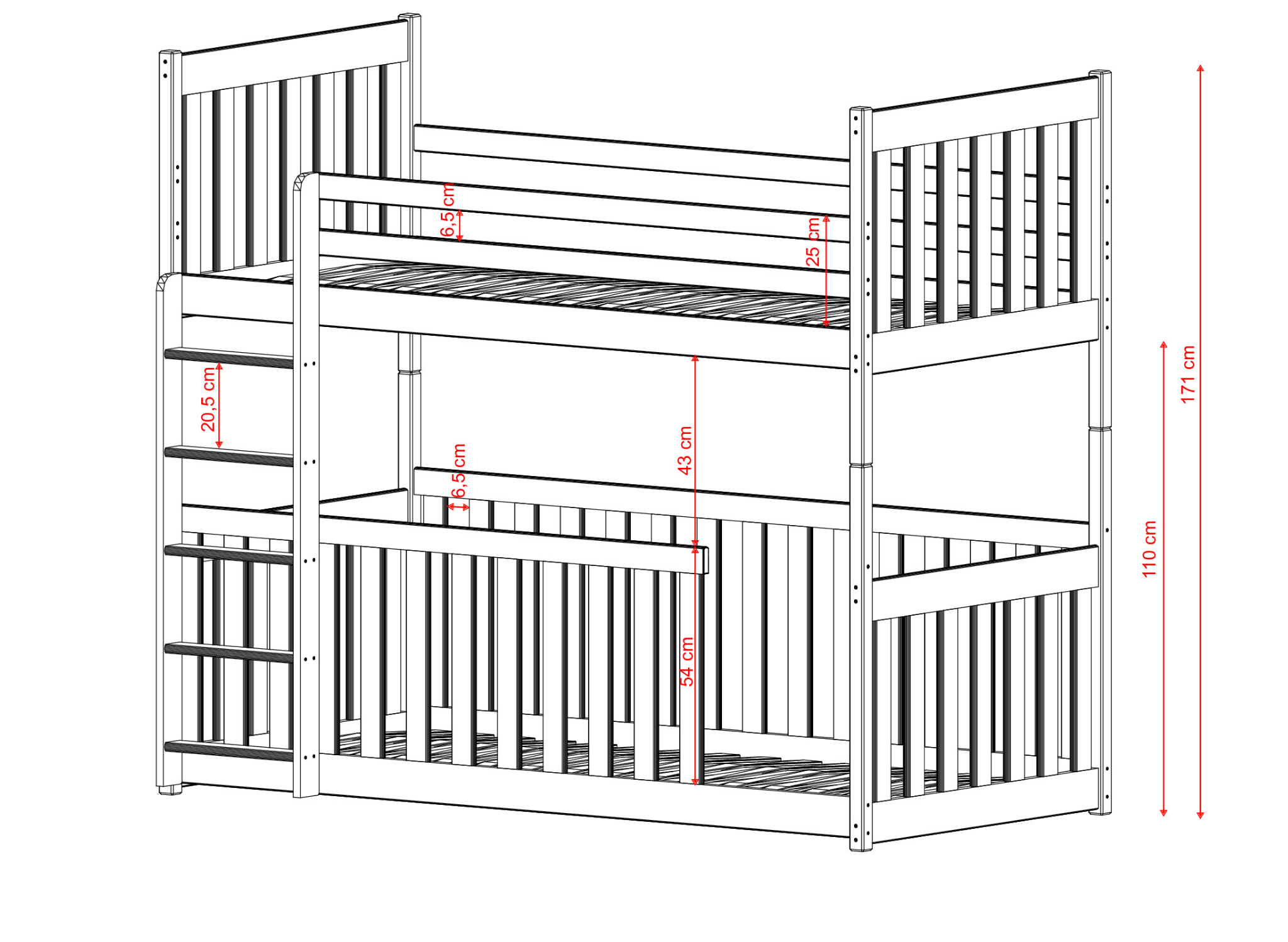 Barnsängen CRIS kan konfigureras ganska fritt. Vi erbjuder verkligen många alternativ som kan ändras. Dessutom kan man modifiera versionen av träskyddsräcket eller välja en höjning av avståndet mellan sängarna med över 20 cm. Vi möjliggör också val mellan många madrasser för under- och översäng. Våningssängen CRIS anpassar du perfekt för dina barn!