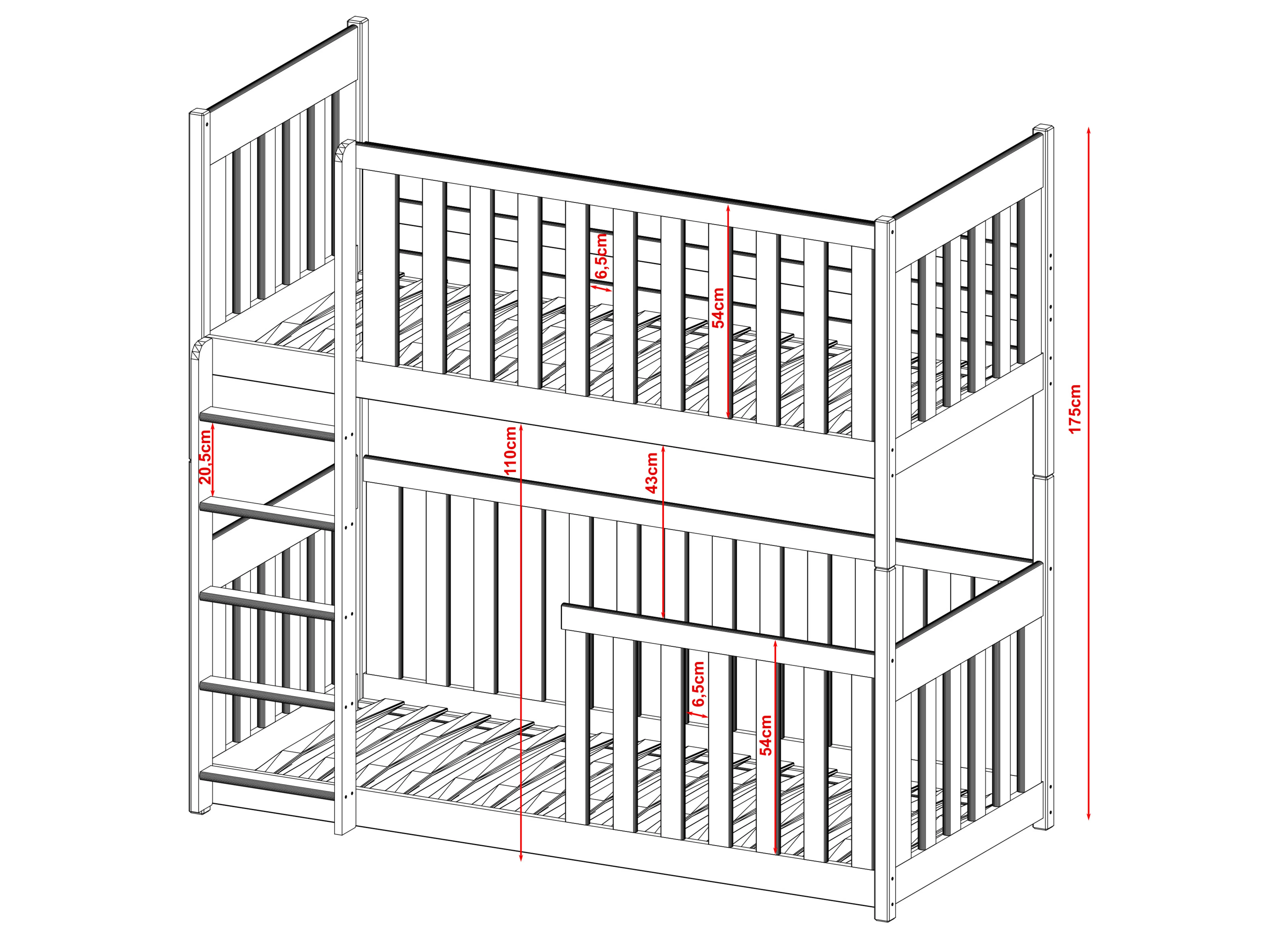 Våningssängen KONRAD är unik och hjälper dig att skapa en oslagbar atmosfär i barnrummet. De höga räckena ger inte bara trygghet under sömnen, utan kan även fungera som en fantastisk dekorationsyta. KONRAD-sängens träräcken kan du dekorera med ljusslingor eller dina barns pappersfigurer. I ett sådant barnrum kommer dina barn att känna sig fria, tack vare våningssängen KONRAD. En av de viktigaste funktionerna hos KONRAD-sängen är de höga skyddsräckena. Du kan välja mellan flera typer: fasta barierki, avtagbara, ¾ eller ½. Oavsett vilket alternativ du väljer garanterar de ditt barns säkerhet under sömnen. För lite äldre barn kan du även välja KONRAD barnsäng utan räcken. I setet ingår också en bekväm stege med breda stegpinnar, vilket underlättar för de små att klättra upp till den övre våningen. Vid montering av våningssängen KONRAD kan du själv bestämma på vilken sida ingången ska sitta.