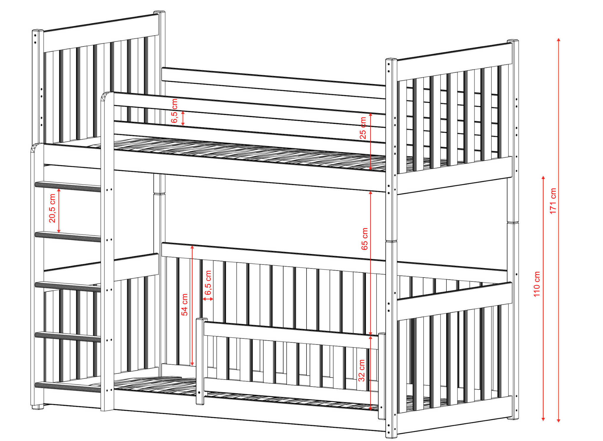Barnsängen CRIS kan konfigureras ganska fritt. Vi erbjuder verkligen många alternativ som kan ändras. Dessutom kan man modifiera versionen av träskyddsräcket eller välja en över 20 cm hög höjning av avståndet mellan sängarna. Vi möjliggör också val mellan många madrasser för under- och översängen. Våningssängen CRIS anpassar du perfekt för dina barn!