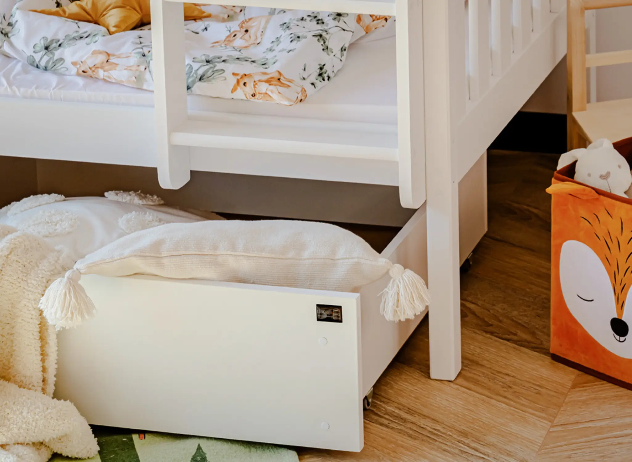 Man kan aldrig få för mycket förvaringsutrymme. Det är vår filosofi, och därför är våra sängar inte bara vackra och robusta, utan även praktiska. När du beställer en IGNAŚ våningssäng kan du välja till matchande lådor. Deras bredd och höjd gör att du enkelt kan förvara barnens extra sängkläder där. Lådorna är utrustade med hjul, vilket gör dem mycket lätta att rulla ut, och det minimalistiska handtaget ger lådorna en elegant touch. IGNAŚ våningssäng från Lano Meble är anpassad även för yngre barn. Båda sängdelarna har skyddsräcken i trä, så även de små som sover oroligt är trygga. Men det är inte allt – när dina barn blir äldre kan du snabbt montera bort det nedre räckat för att göra det enklare att gå i och ur sängen.