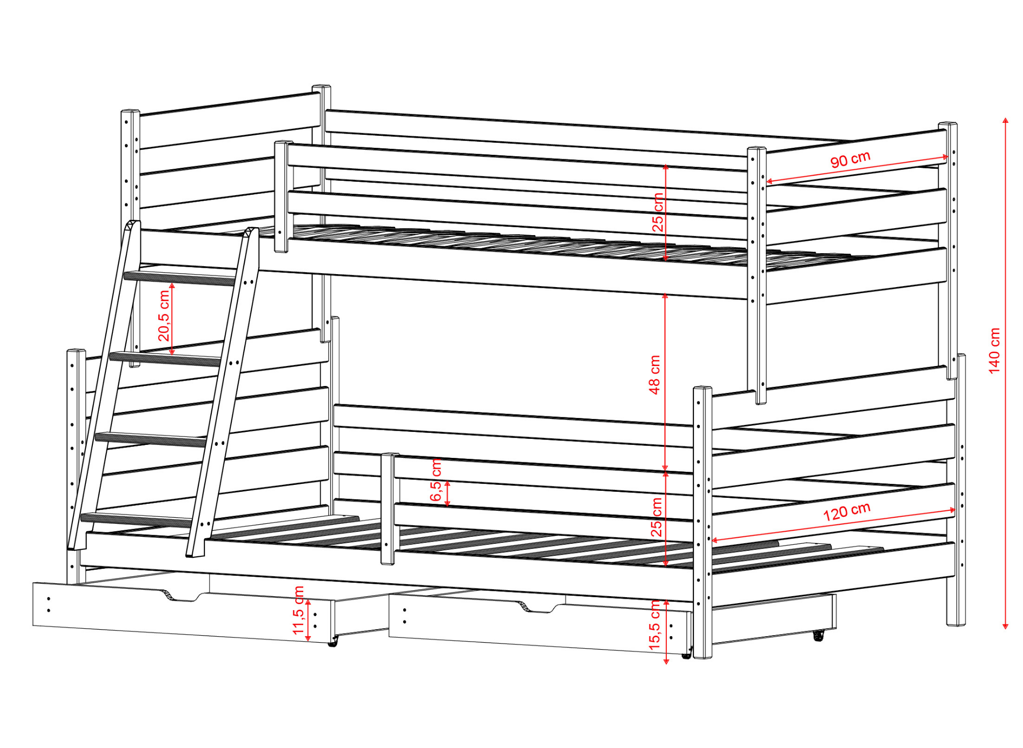 Nämnde vi att dina barn kommer att älska våningssängen FAMI från tidig ålder? Nu ska vi berätta om något som får dig att älska den lika mycket. Vi pratar om stegen som är monterad i vinkel. Tack vare denna lösning kan dina barn (även de yngre) enkelt och framför allt säkert klättra upp och ner från loftsängen FAMI, så att du kan sova lugnt. Låt oss vara ärliga, förvaringsutrymme kan man aldrig få för mycket av, och det vet vi väl. Därför ser vi på Lano Meble till att våra sängar inte bara är bekväma, utan även praktiska. Våningssängen FAMI kan utrustas med två lådor, där dina barn kan förvara mer än bara en extra filt eller kudde – kanske en bok eller en surfplatta.