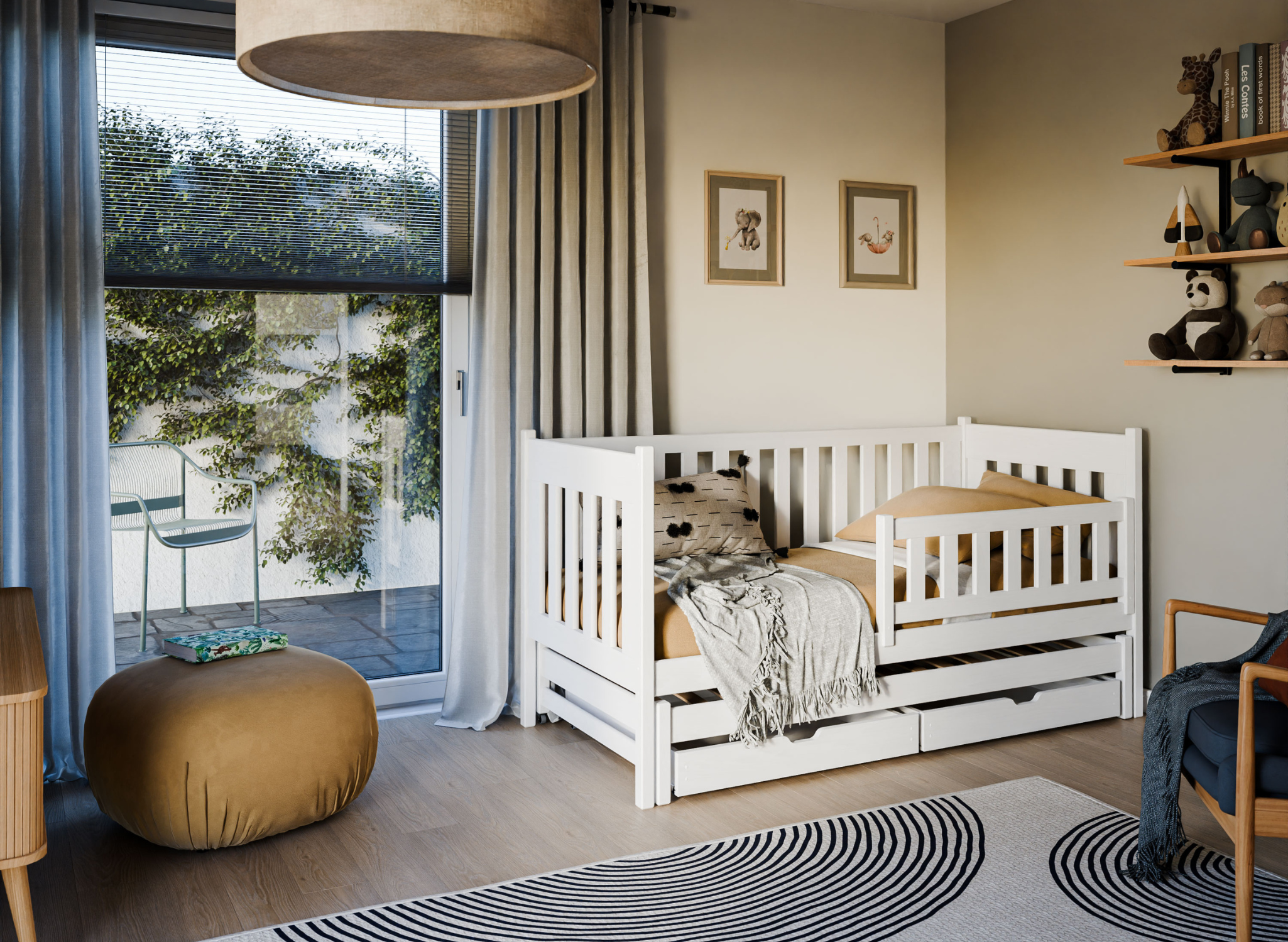 För att göra KAJA låg våningssäng ännu mer funktionell, välj utdragbara lådor. Det är extra plats för förvaring av kläder, leksaker och sängkläder. Lådorna är rymliga och fungerar oberoende av varandra, så att varje syskon kan ha sin egen. KAJA låg våningssäng är tillverkad av naturligt furuträ. Det är ett extremt robust material med hög mekanisk motståndskraft. Konstruktionen av den utdragbara sängen KAJA är hållbar och tål både små och stora belastningar, vilket gör att dina barn kan använda den i många år.