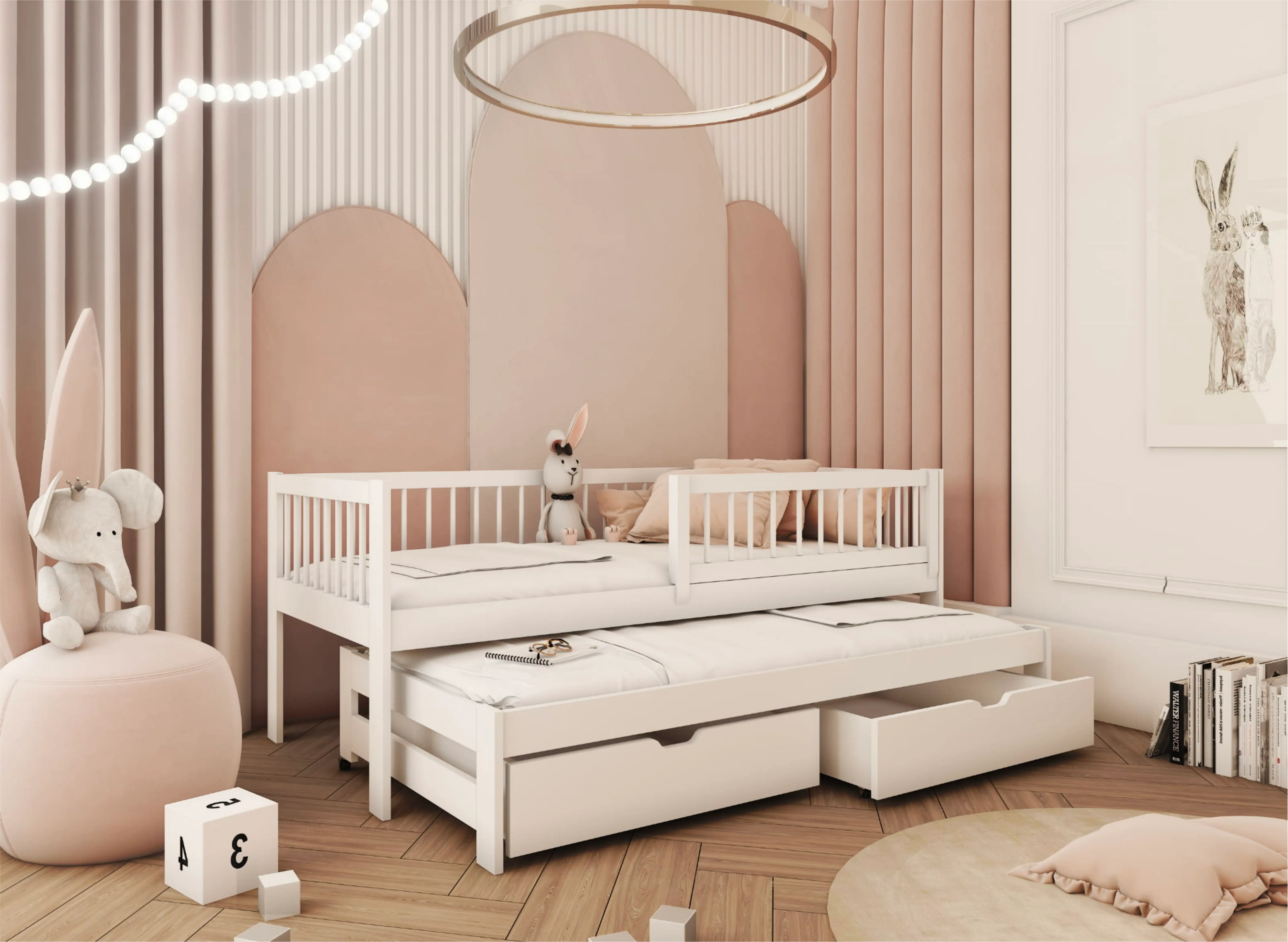 Barnsängen SOFTI är det perfekta valet för två småttingar som alltid vill vara nära varandra. Detta är bara en av fördelarna med denna vackra möbel. Andra inkluderar till exempel den enkla men fängslande konstruktionen som ger varje barnrum ett sagolikt utseende. Bekvämlighet, komfort och hållbarhet i åratal – det är mottot för barnsängen SOFTI. SOFTI-sängen uppskattas inte bara för sitt utseende och den komfort den erbjuder. Den har praktiska bekvämligheter i form av en utdragbar säng och rymliga lådor som du kan använda till vad du vill. Du kan till exempel förvara kläder eller barnens leksaker där. Extra förvaringsutrymme i barnrummet är alltid guld värt, eller hur?
