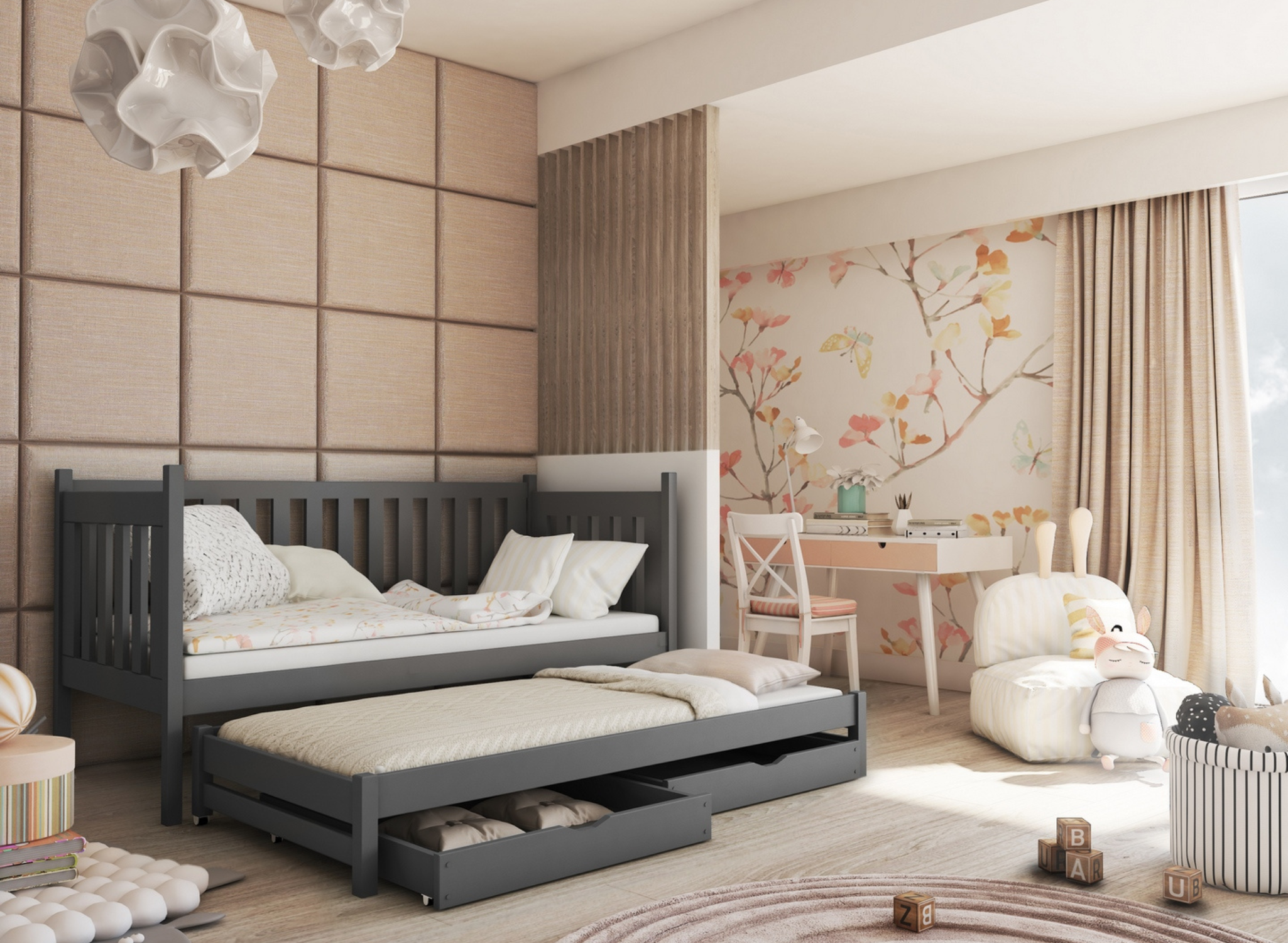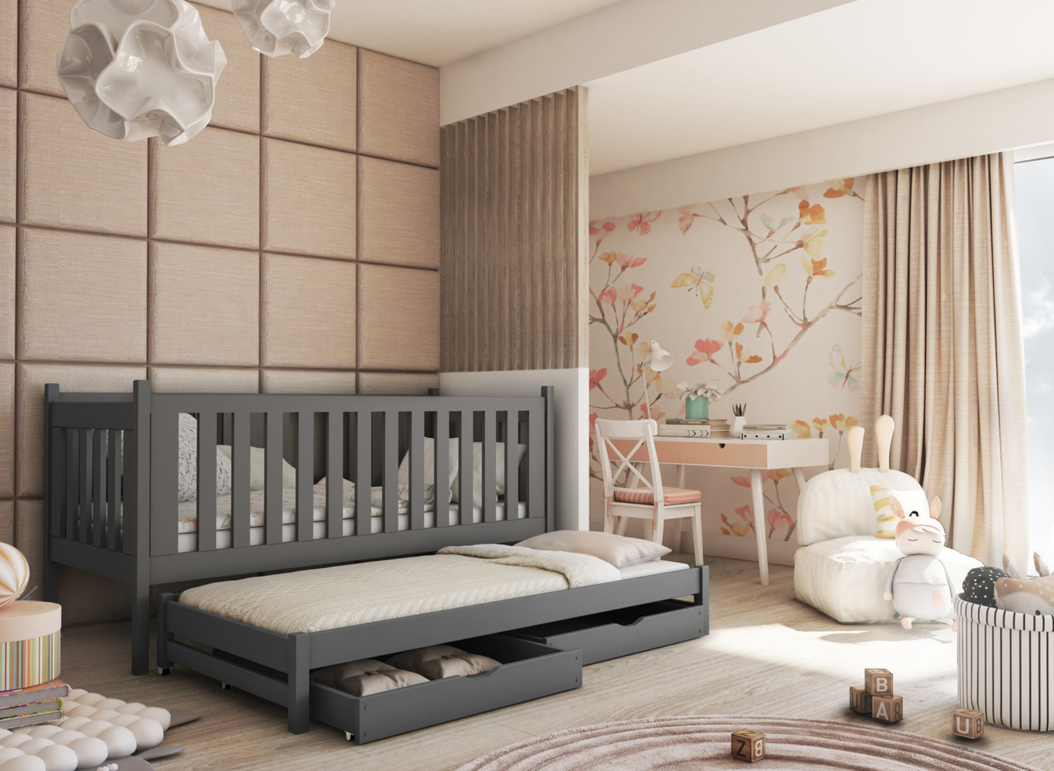 Grafitgrå utdragbar barnsäng KAJA med lådor – extra plats för leksaker och sängkläder