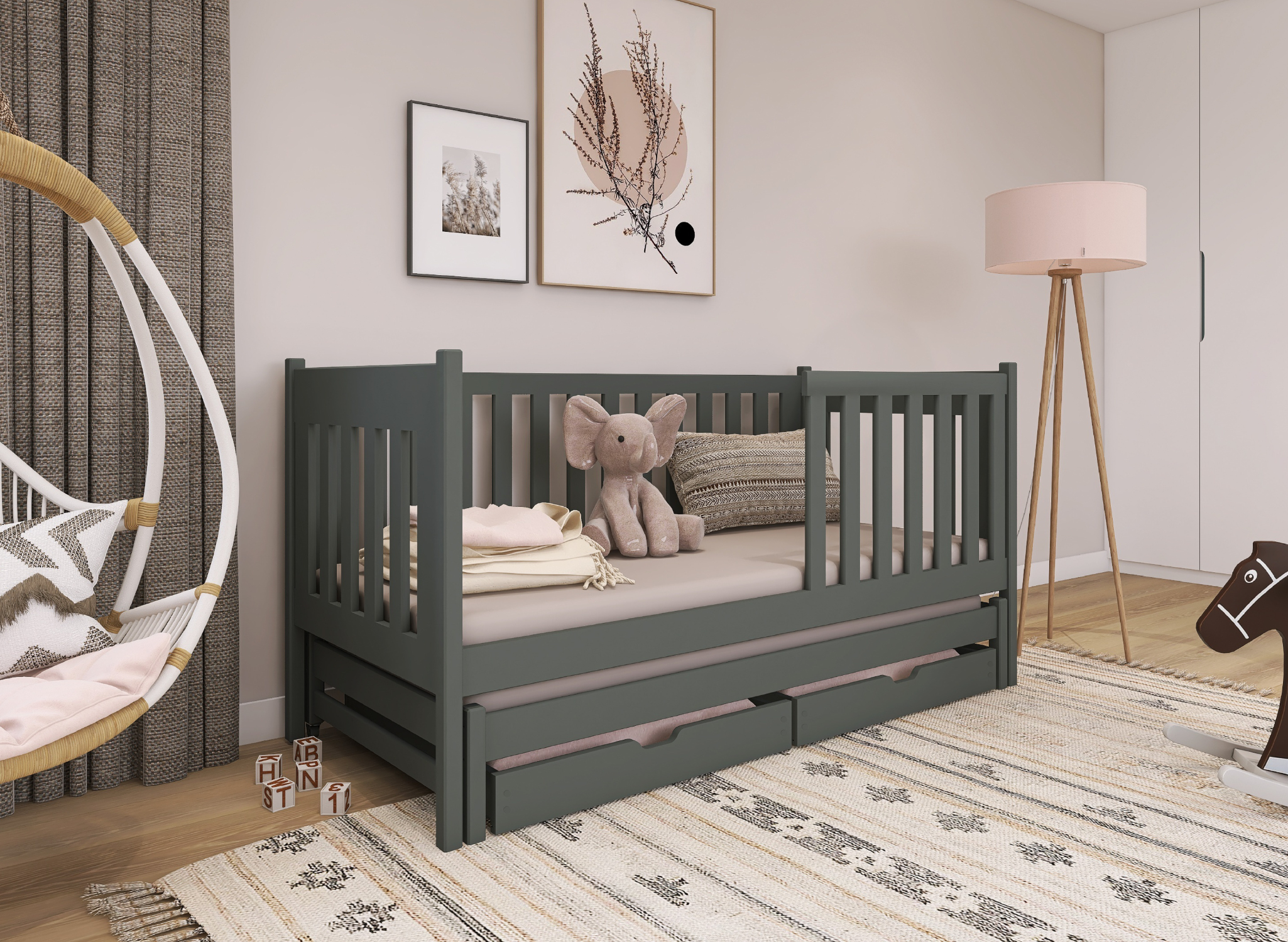Säkra steg, hög barriär: grafitgrå barnsäng KAJA med extrasäng 90x190