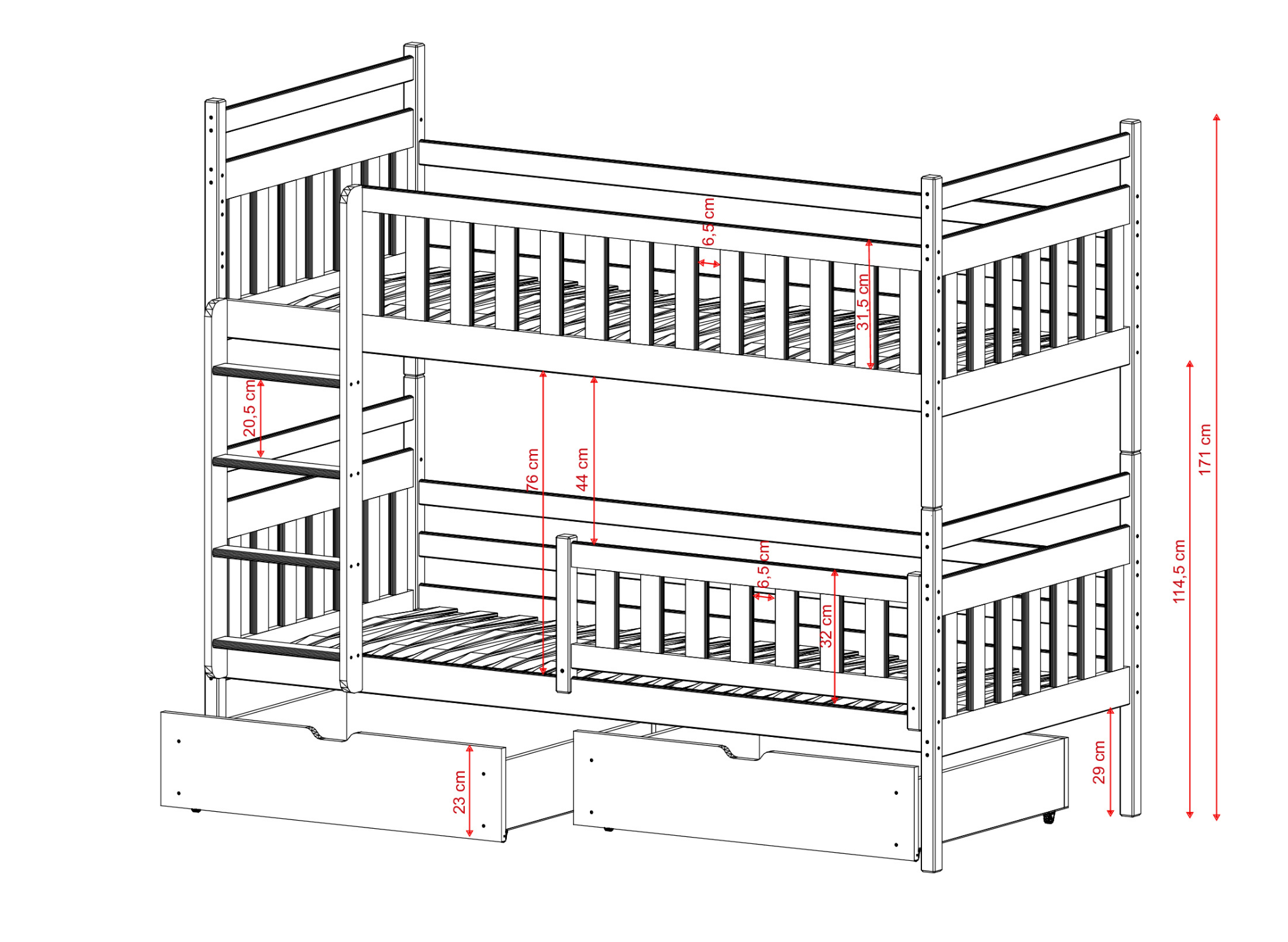 MONIKA våningssäng är en utmärkt lösning inte bara för små utrymmen, utan även för varje barnrum där syskon bor. Varför? En sådan säng stimulerar fantasin och främjar kreativitet. Se även på den praktiska sidan av syskonsängen MONIKA. Båda delarna kan separeras, vilket skapar två oberoende sovzoner. När du beställer vår MONIKA våningssäng ger vi dig stor frihet. Du kan personifiera möbeln så att den passar dina barns behov. Det är du som bestämmer om utrymmet under sängen ska utrustas med två lådor. Vid beställningstillfället bestämmer du också om skyddsräckena på MONIKA våningssäng ska vara fast monterade eller avtagbara.
