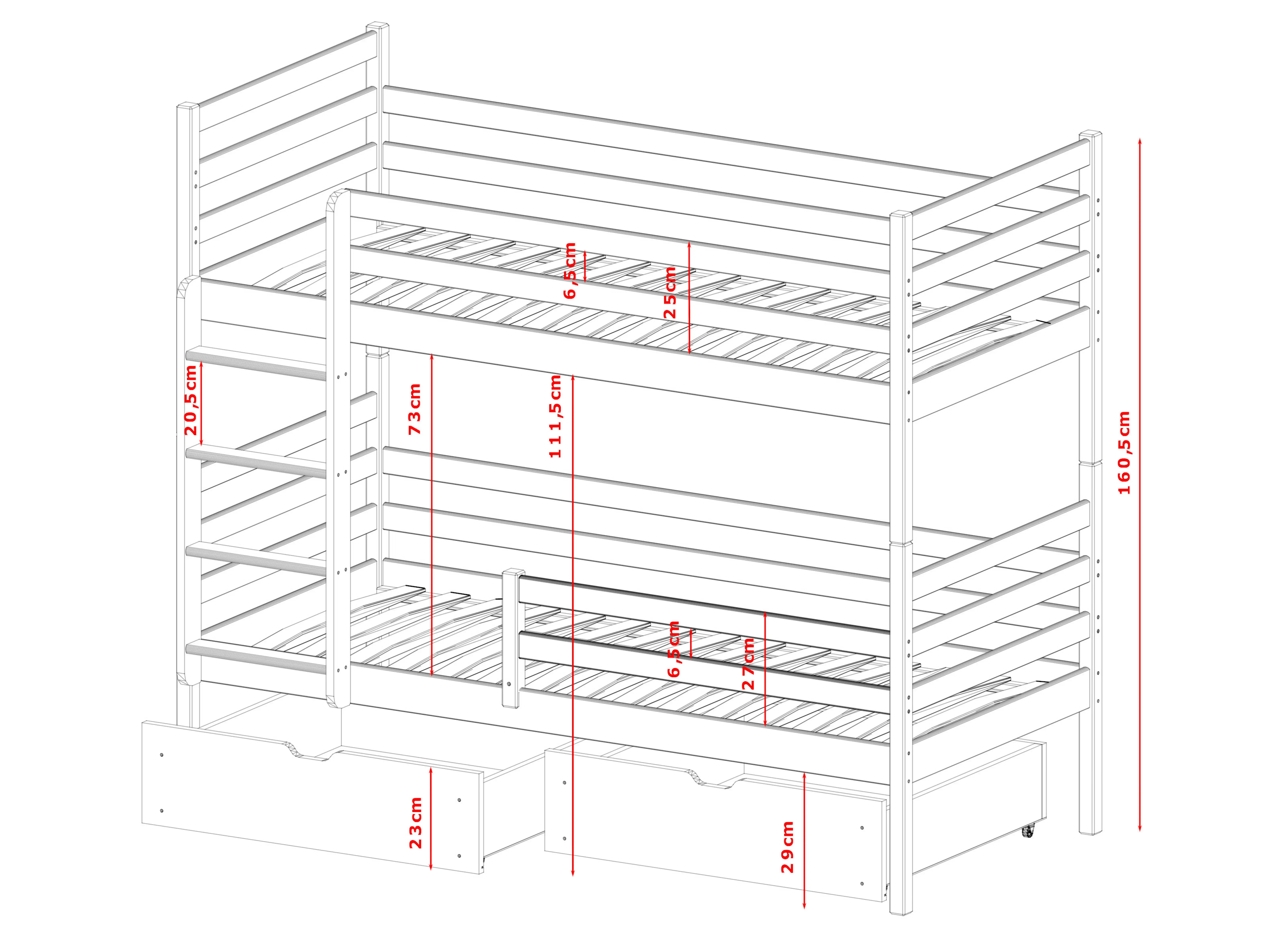 Låt oss vara ärliga. Nästan varje barns dröm är en våningssäng. Att klättra upp till övervåningen via en välformad trastege är en fantastisk känsla och en spännande attraktion. Det är dock värt att välja beprövade och solida lösningar från Lano Meble, som våningssängen NEMO. Denna barnsäng NEMO är mer än bara en plats för vila. Det är också en praktisk organisering av utrymmet och en plats för många äventyr. Dessutom tar våningssängen NEMO andan ur en med sin unika design. Ingen kommer att kunna gå förbi den obemärkt. Möbeln erbjuder två bekväma sovplatser, vilket gör att dina barn vaknar utvilade och fulla av energi. De två rymliga lådorna längst ner på sängen förtjänar extra uppmärksamhet. De är tillräckligt stora för att rymma leksaker, barntillbehör eller olika textilier.