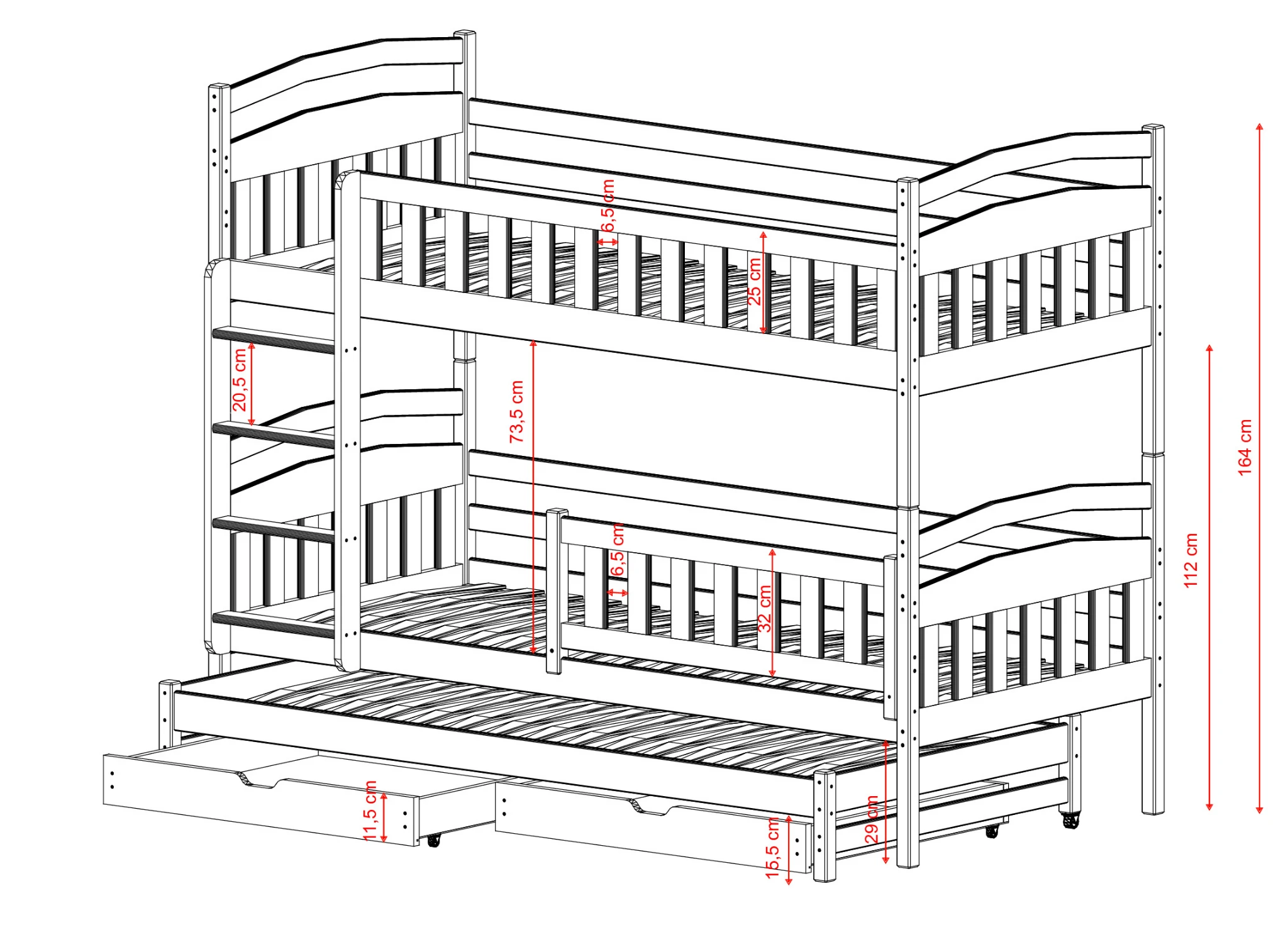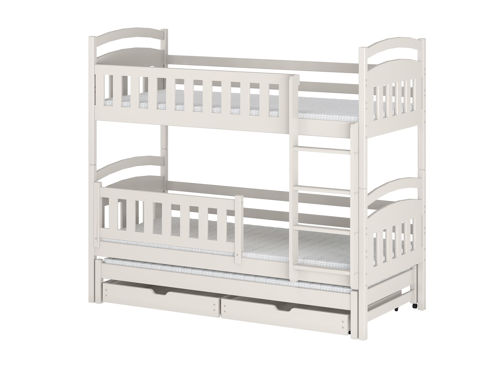 Längst ner på BLANKA våningssäng för tre personer kan det finnas utdragbara lådor, om du väljer det alternativet. Deras rymliga inre rymmer mycket som annars tar upp plats i barnrummet, t.ex. leksaker som inte använts på länge eller filtar som bara tas fram på vintern. Den extra utdragbara madrassen i botten blir en ovärderlig hjälp när barnet bjuder in vänner på övernattning – det ger gästerna komfort utan att man behöver leta efter extra luftmadrasser.