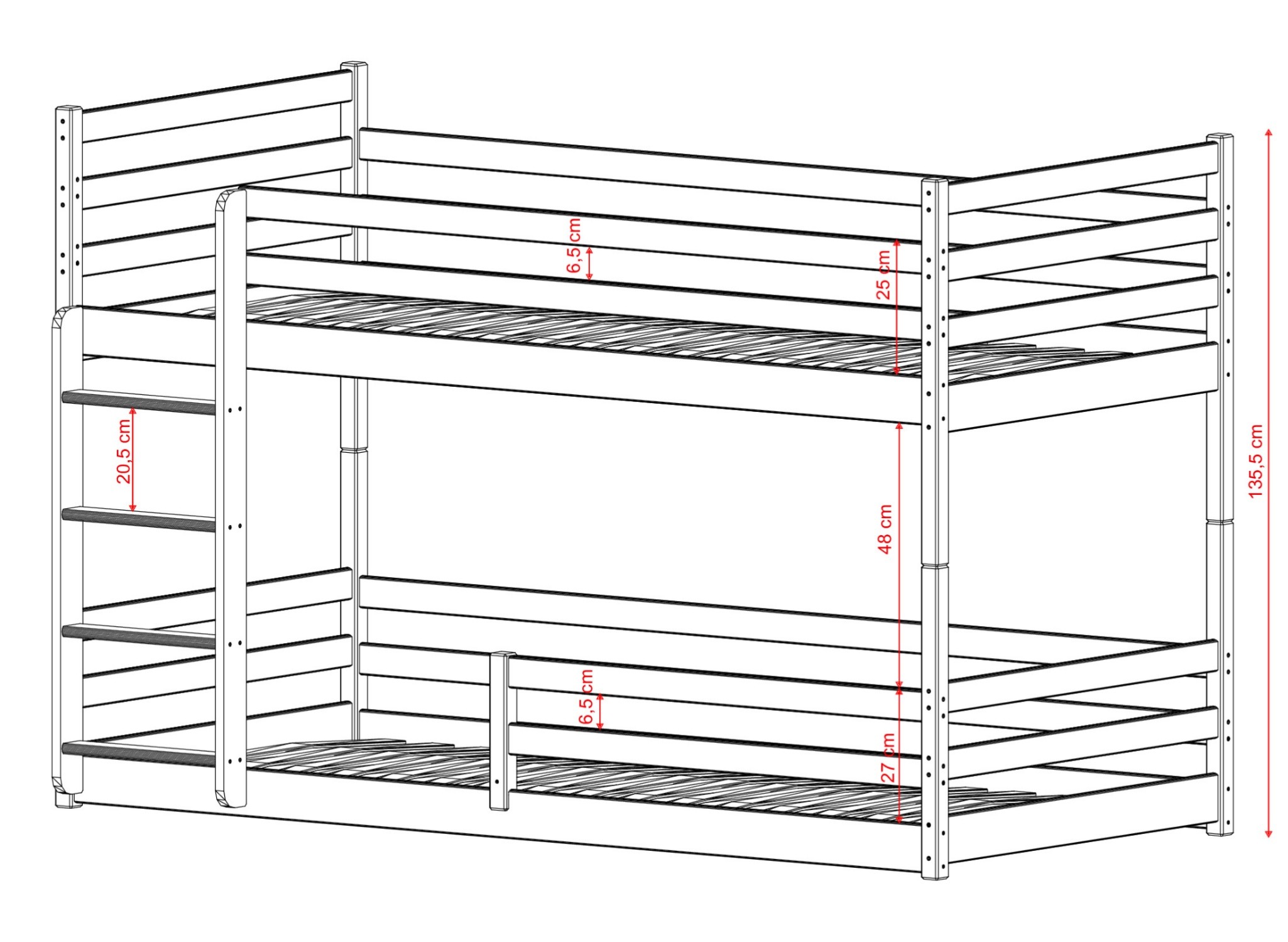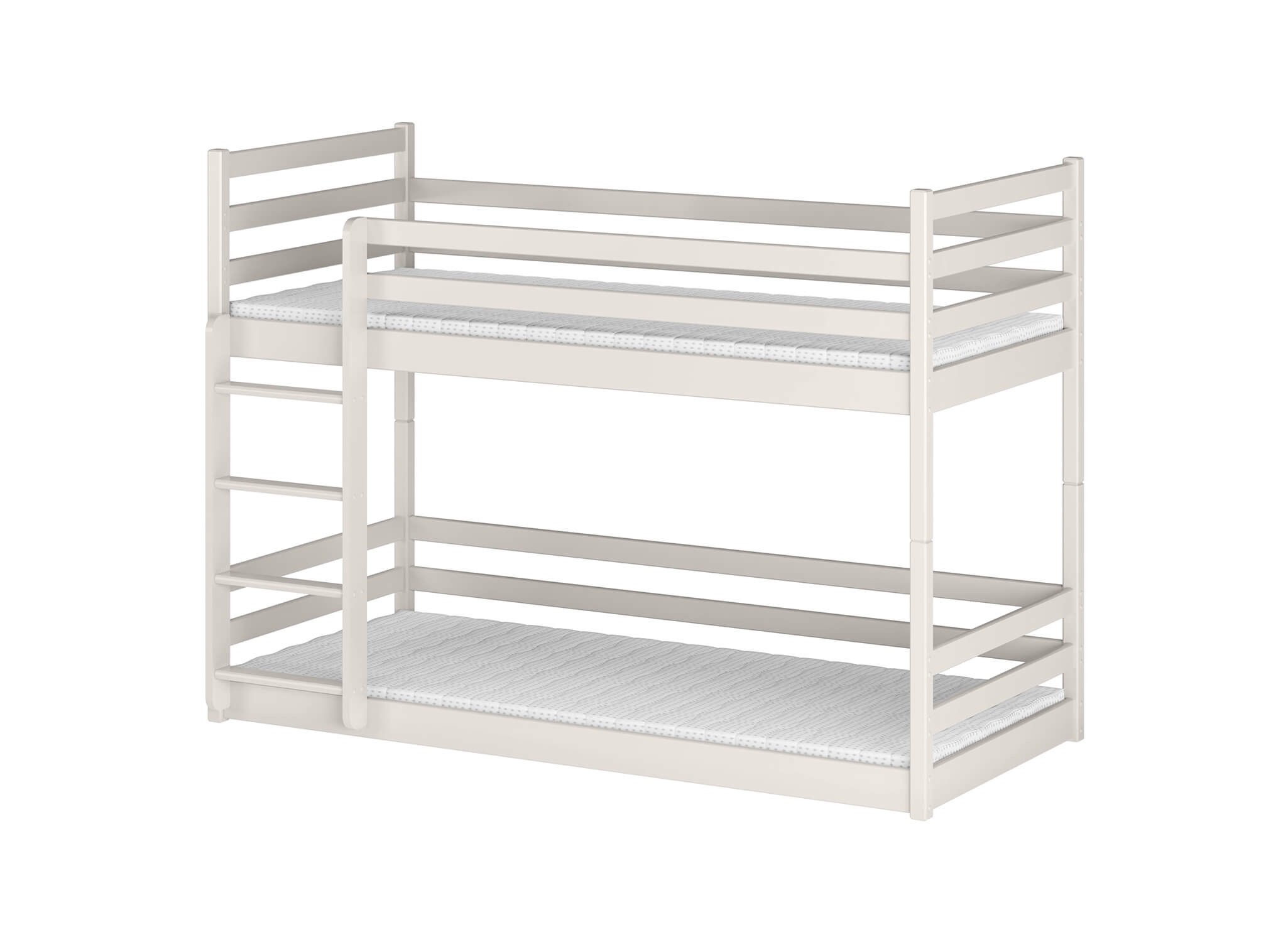 Våningssängen MINI är en möbel som utvecklats baserat på erfarenhet och observationer av barn. Tack vare detta har vi skapat en lösning som är extremt bekväm och säker, samtidigt som dess stil passar in i många olika inredningar. Möjligheten att välja vilken sida stegen ska monteras på gör att våningssängen MINI är ett perfekt val oavsett barnrummets storlek och form. Vänta inte, bli en av Lano Mebles nöjda kunder redan idag. Två barn i huset är definitivt en stor glädje! I ett sådant fall måste du dock alltid tänka på funktionella lösningar som sparar plats. Våningssängen MINI uppfyller dessa förväntningar till fullo! En sådan möbel är bokstavligen en dröm som går i uppfyllelse för varje litet barn. Upptäck vad mer den kan överraska dig med. Konstruktionen av våningssängen MINI består av furu, vilket är ett mycket hållbart material. Detta är en lösning som garanterat kommer att tilltala alla barn, oavsett ålder eller kön. Sängens utmärkta proportioner och omsorgsfulla utförande garanterar en bekväm, lugn och djup sömn för två barn.