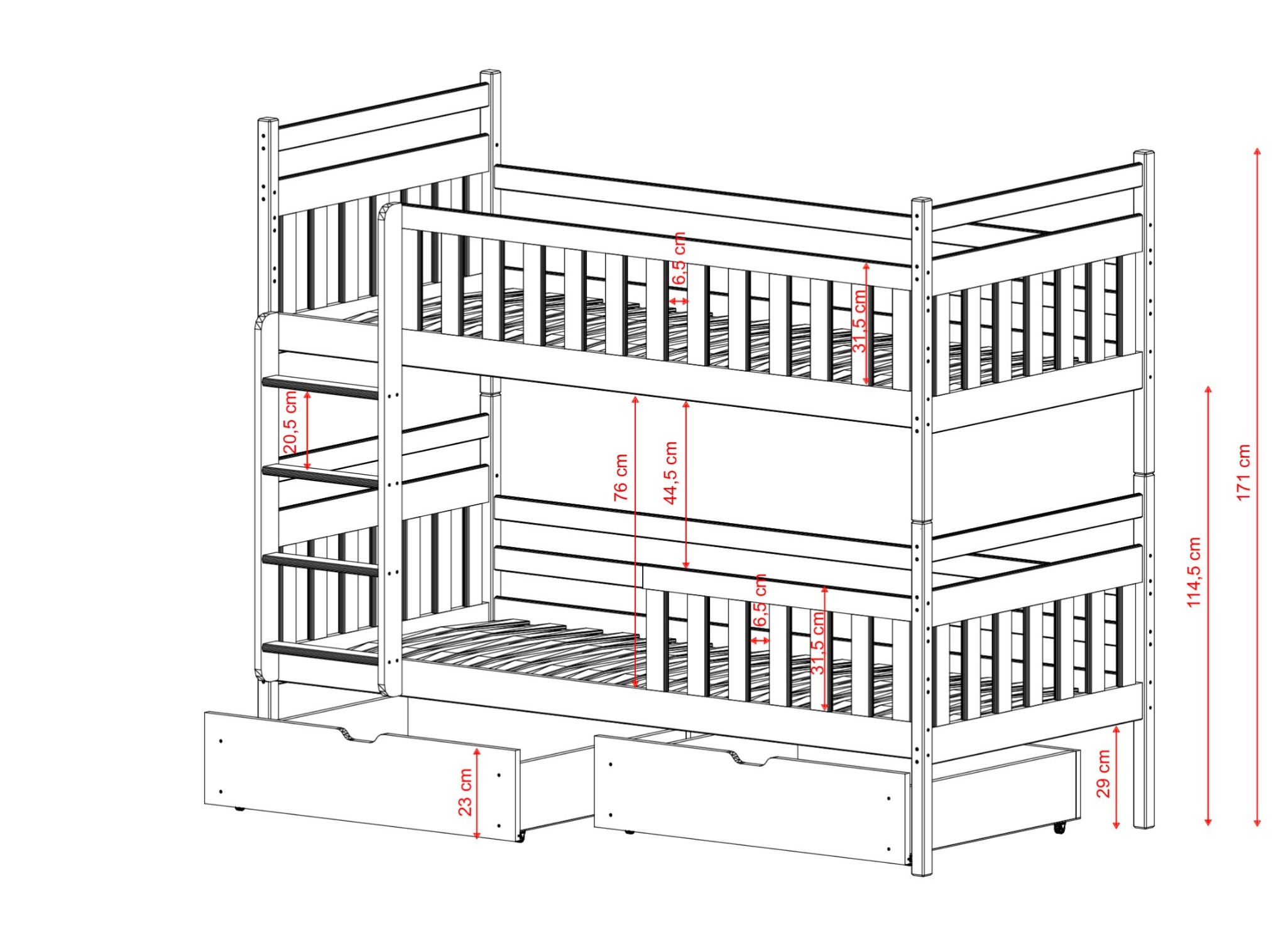 Våningssängen MONIKA är en utmärkt lösning inte bara för små utrymmen, utan för alla barnrum där syskon bor. Varför? En sådan säng stimulerar fantasin och stöder kreativiteten. Se även på den praktiska sidan av syskonsängen MONIKA. Båda delarna kan delas på, vilket skapar två oberoende sovzoner. När du beställer vår våningssäng MONIKA ger vi dig stor frihet. Du kan personanpassa möbeln så att den passar dina barns behov. Det är du som bestämmer om utrymmet under sängen ska utrustas med två lådor. Vid beställning avgör du även om skyddräckena på våningssängen MONIKA ska vara fast monterade eller avtagbara.